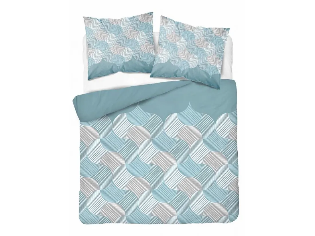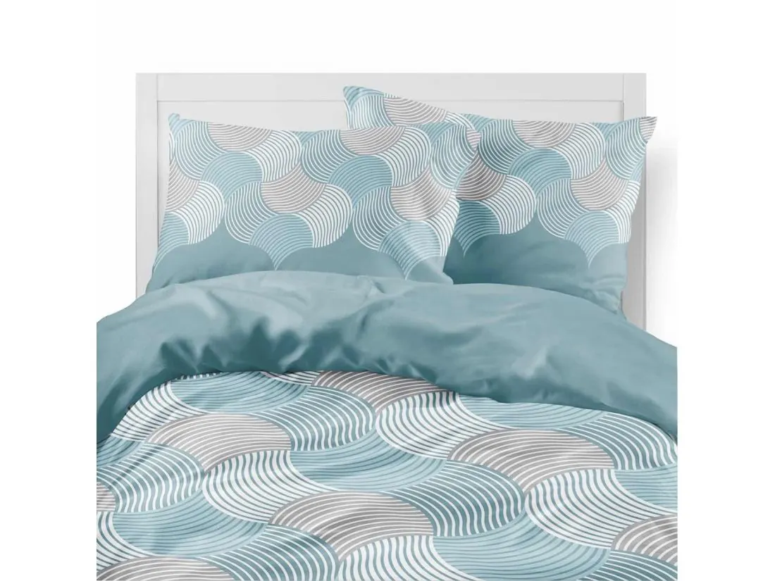 Wzór składa się z nowoczesnych geometrycznych kształtów – prostokątów, rombów i linii – rozmieszczonych w sposób harmonijny, tworząc stylową, spokojną kompozycję. Paleta kolorystyczna obejmuje stonowany odcień szałwii, czystą biel oraz neutralną szarość, dzięki czemu pościel idealnie wpisuje się w wystrój sypialni w stylu skandynawskim, minimalistycznym lub nowoczesnym. To wzór, który łączy prostotę z elegancją – nie dominuje we wnętrzu, ale wprowadza porządek i wizualną równowagę.