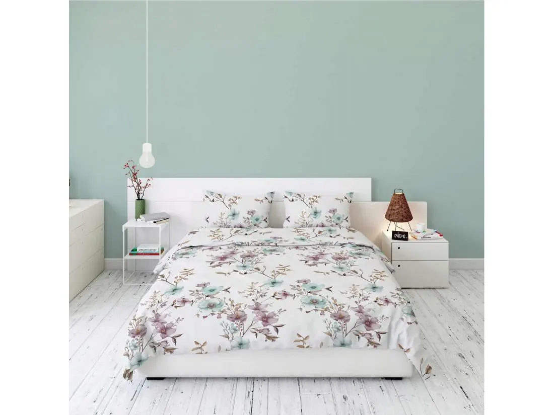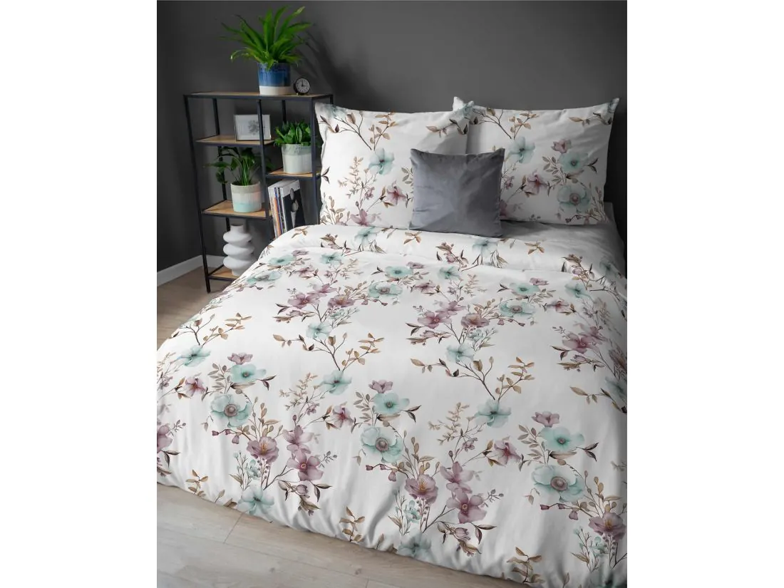 Delikatny wzór przedstawia drobne kwiatki w pastelowych odcieniach różu, lila, błękitu i beżu, rozmieszczone na jasnym tle (kremowym lub lekko beżowym). Całość tworzy lekką, romantyczną kompozycję w stylu kwiatowej łączki – subtelną, ale pełną uroku. Kolorystyka jest stonowana i harmonijna, co sprawia, że pościel doskonale wpasuje się w sypialnie urządzone w stylu prowansalskim, rustykalnym, klasycznym czy skandynawskim.