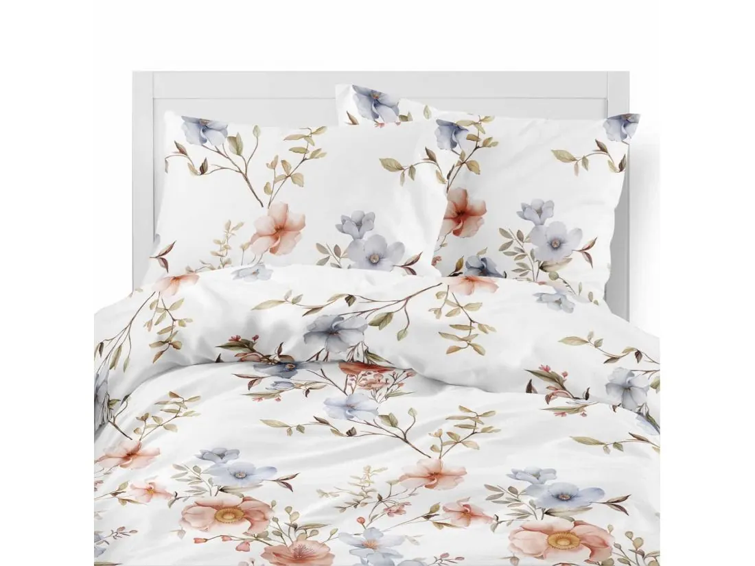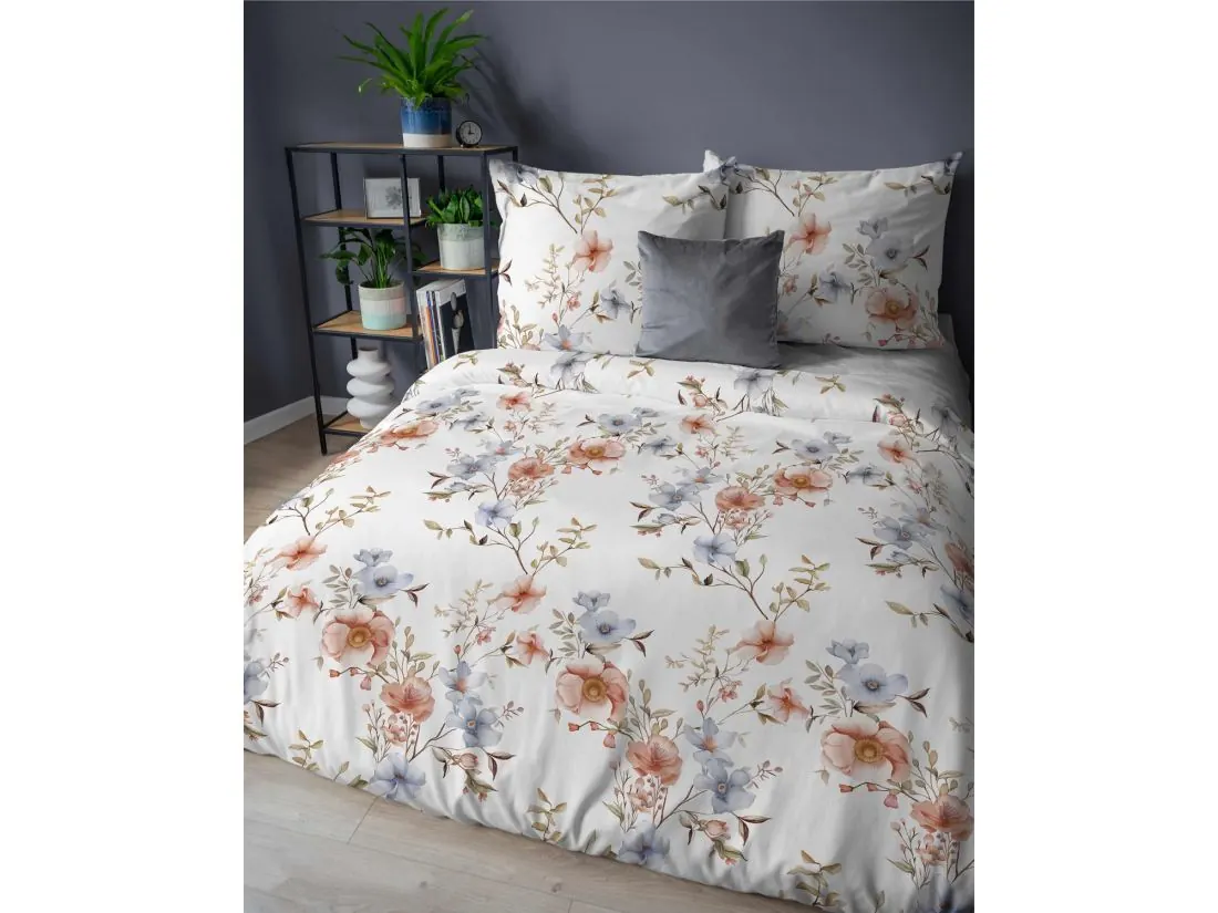 Wzór przedstawia drobne, delikatne kwiaty w odcieniach złota i szarości, równomiernie rozmieszczone na jasnym, kremowym tle. Ta subtelna kompozycja przywodzi na myśl delikatną łączkę w stonowanej, eleganckiej palecie barw. Złote akcenty dodają pościeli ciepła i lekkości, a szarości równoważą całość, tworząc wzór, który nie przytłacza, a jednocześnie nadaje sypialni charakteru i wyrafinowania.