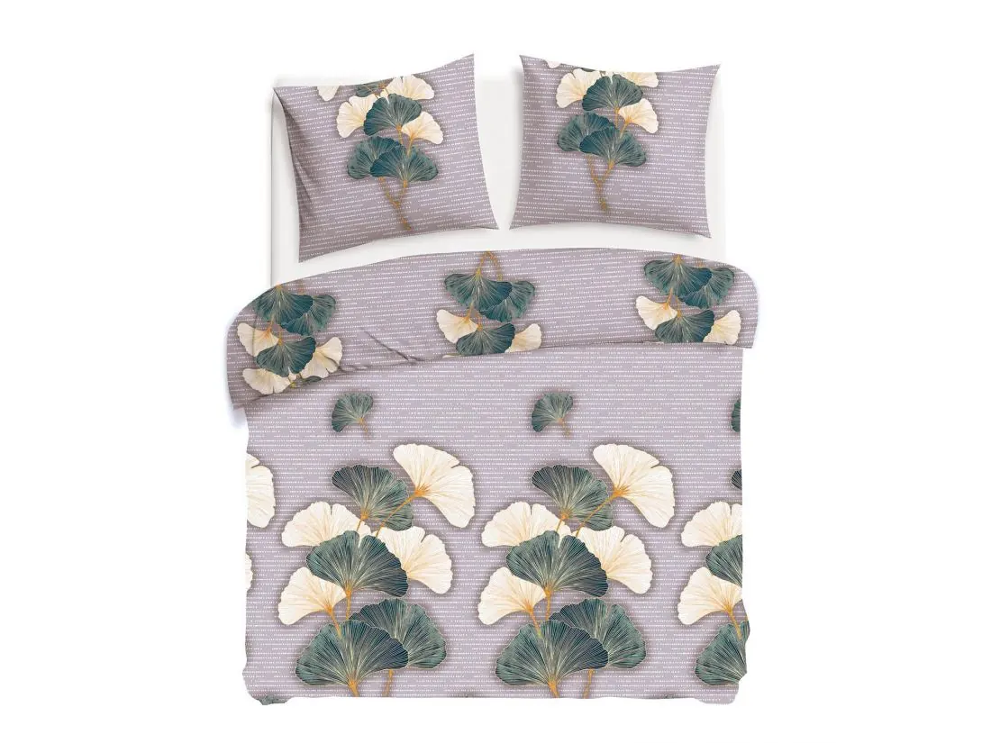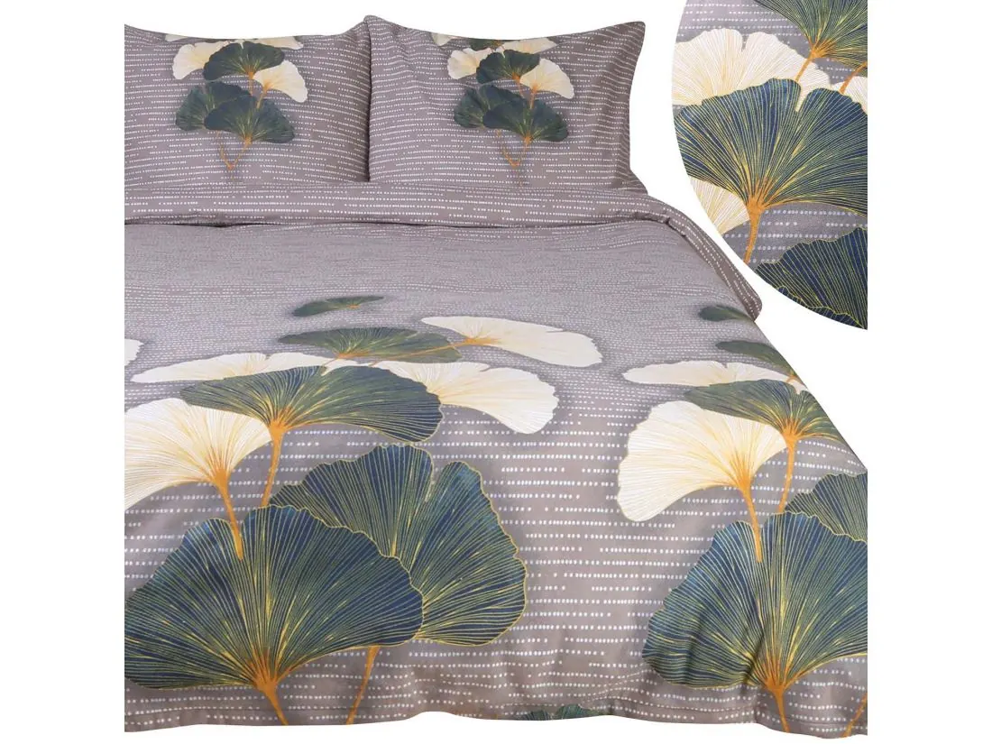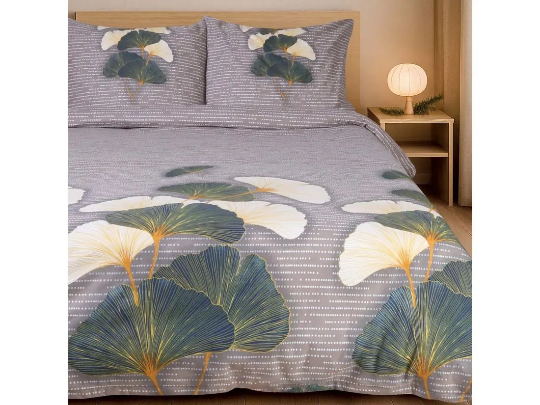Wzór pościeli z flaneli zdobią delikatne liście miłorzębu w odcieniach zieleni i kremu, które tworzą naturalną, spokojną kompozycję na jasno szarym tle. Zieleń liści wprowadza świeżość i harmonijny akcent, natomiast kremowe detale dodają subtelnej elegancji. Jasnoszare tło stanowi idealne tło, które podkreśla delikatność wzoru, jednocześnie nadając mu nowoczesny i uniwersalny charakter. Pościel z flaneli, dzięki swojej miękkiej i ciepłej strukturze, dodatkowo podkreśla przytulny, naturalny klimat wzoru, zapewniając komfortowy i ciepły sen przez cały rok.