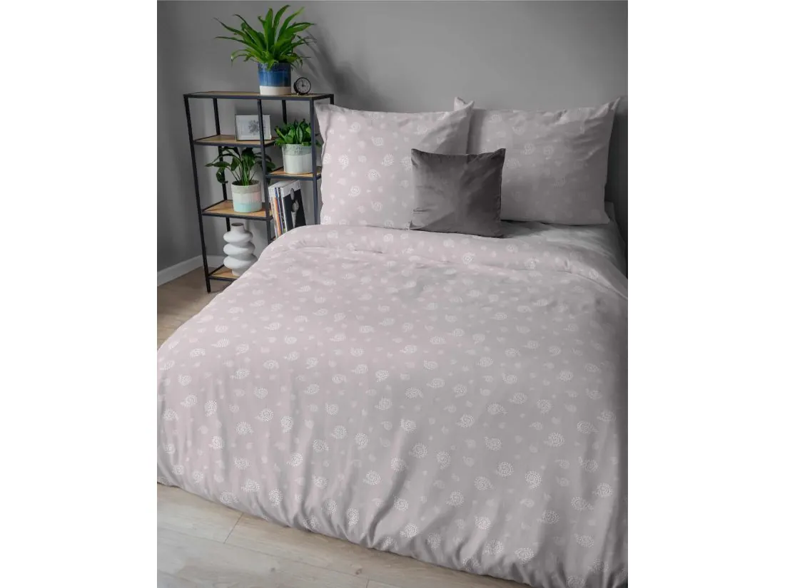 Tło w modnym, stonowanym pastelowym kolorze nadaje pościeli spokojny i harmonijny charakter, który wprowadza do sypialni atmosferę relaksu i wyciszenia. Wzór przypominający spiralne linie rozciąga się równomiernie po całej powierzchni – organiczny, lekko hipnotyzujący motyw przyciąga wzrok, a jednocześnie nie dominuje we wnętrzu. To połączenie minimalizmu i natury sprawia, że pościel świetnie komponuje się z nowoczesnymi, boho i skandynawskimi aranżacjami.