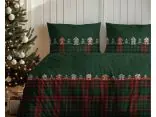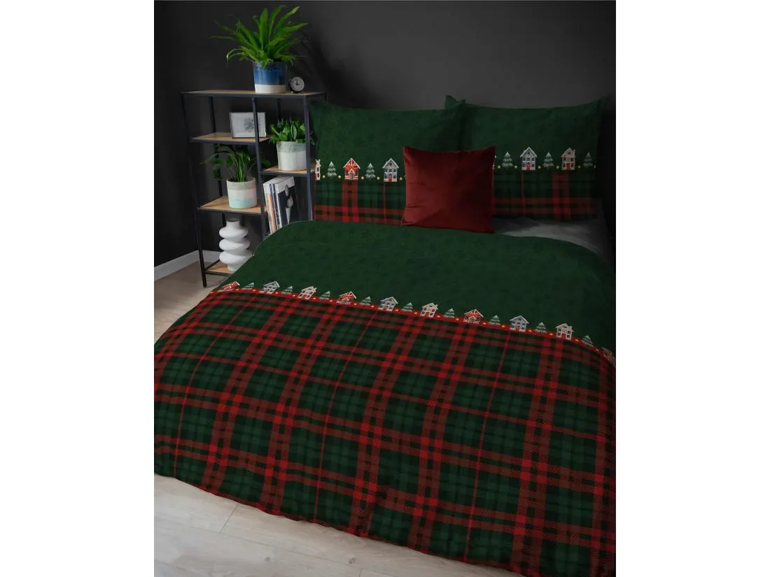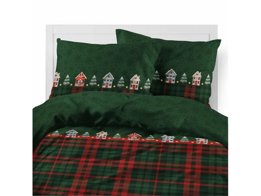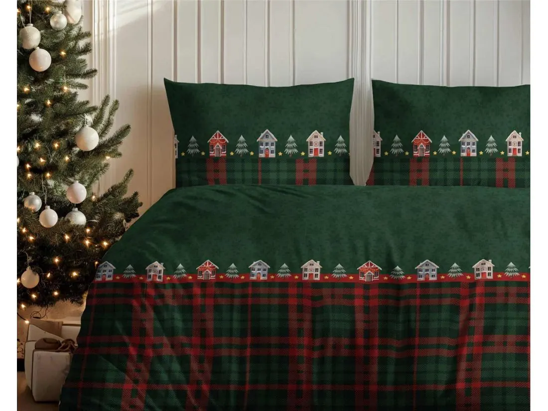 Wzór pościeli przedstawia malownicze świąteczne domki i choinki, osadzone na ciemno zielonym tle, które wprowadza do sypialni spokój i naturalny klimat. Uroku dodają drobne śnieżynki i ciepłe, subtelne kolory dekoracji, przywodzące na myśl zimowy pejzaż za oknem. Całość uzupełnia zielono-czerwona kratka umieszczona u dołu poszwy – klasyczny akcent, który podkreśla świąteczny charakter wzoru i dodaje mu rustykalnego wdzięku.