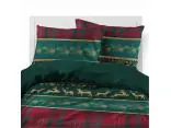 Na ciemnozielonym tle, które przywodzi na myśl zimowy las, rozproszone zostały delikatne śnieżynki, a głównym elementem dekoracyjnym są stylizowane złote renifery – symbol świąt i zimowej magii. Całość dopełniają subtelne stroiki bożonarodzeniowe – gałązki ostrokrzewu, jemioła i szyszki – które dodają naturalnego uroku i tworzą spójną, elegancką kompozycję. Złote akcenty nadruku pięknie kontrastują z głęboką zielenią, wprowadzając do wnętrza nutę luksusu.