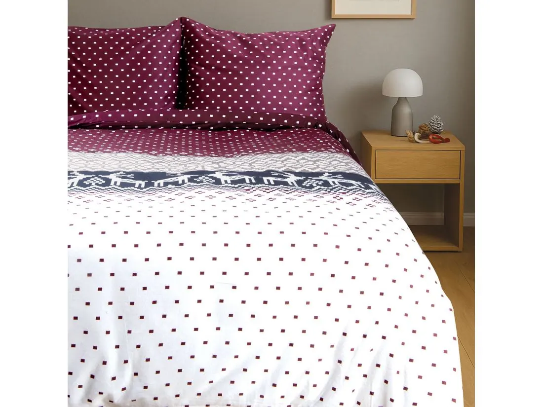 Pościel flanelowa z reniferami i kwadracikami na bordowym tle to idealna propozycja na świąteczny sezon. Urokliwe renifery na białym tle w połączeniu z delikatnym, drobnym wzorem kwadracików w bordowym odcieniu tworzą ciepłą, świąteczną atmosferę. Zestawienie białego tła z bordowymi akcentami nadaje pościeli elegancji i przytulności, doskonale pasując do zimowych, świątecznych aranżacji. Miękka flanela otula ciało, zapewniając komfortowy sen, a elegancki wzór wnosi do sypialni wyjątkowy, zimowy urok.