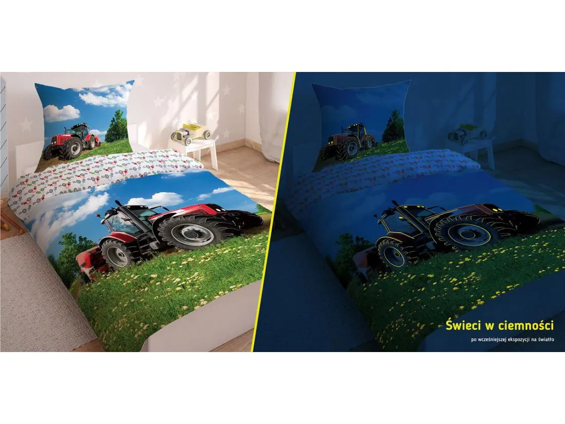 Komplet pościeli fluorescencyjnej dla dzieci oraz młodzieży Traktor wz.2639 b w rozmiarze 160x200 cm z poszewką 70x80 cm została wykonana z wysokogatunkowej bawełny. Wszystkie elementy pościeli zapinane są na suwak, pościel dwustronna z jednej strony nadruk z traktorem, druga strona rotacyjna traktory na białym tle.