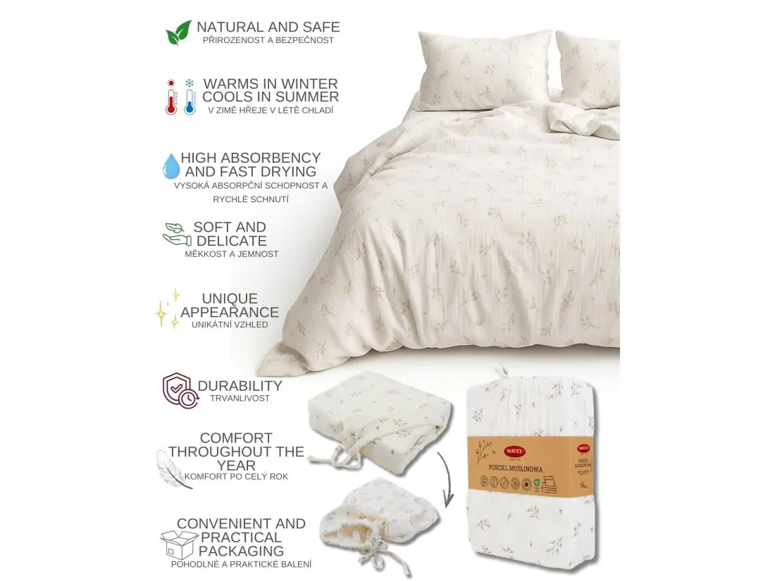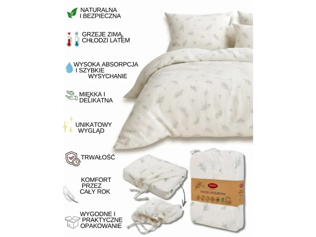 Pościel muślinowa 160x200 – botaniczny wzór gałązek, naturalna bawełna, miękka i oddychająca