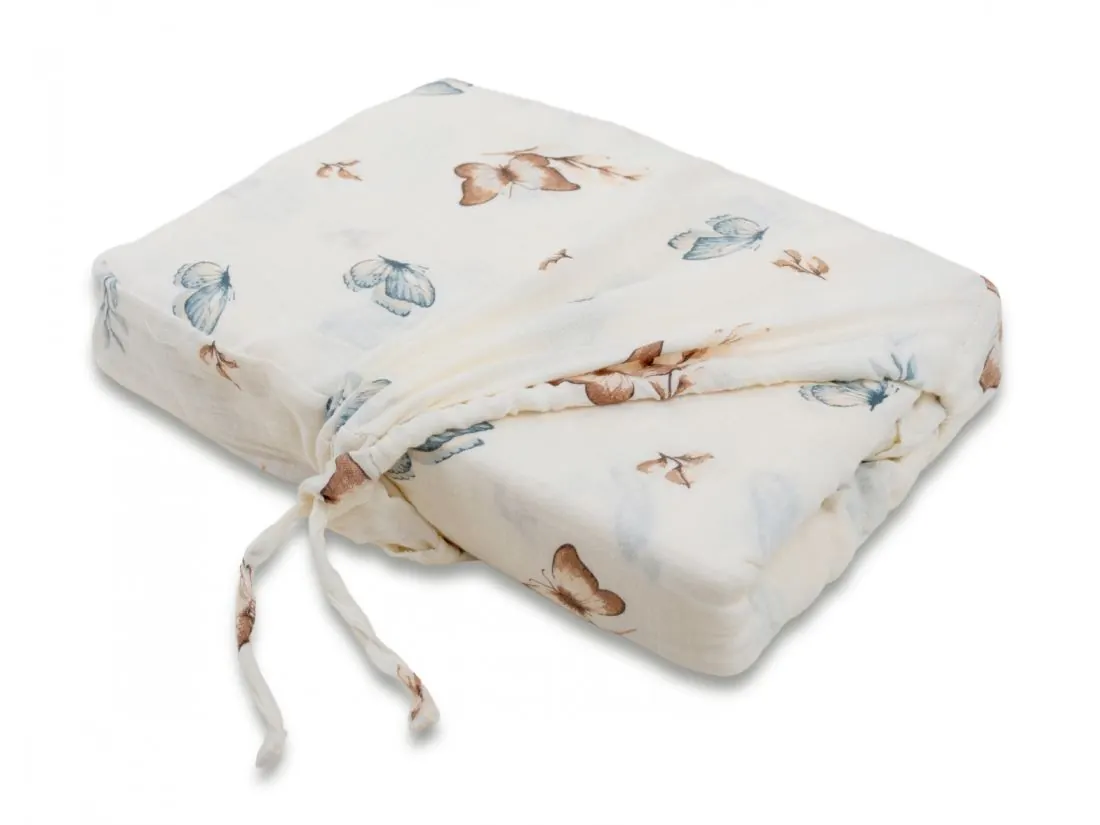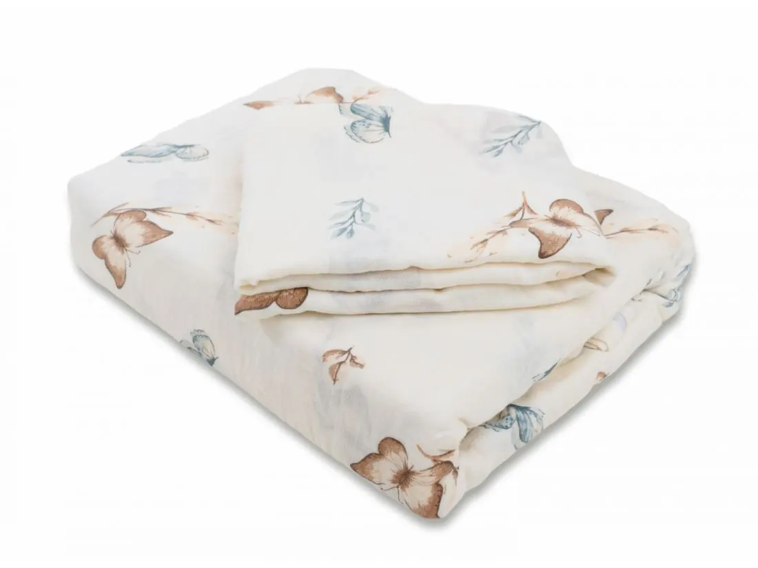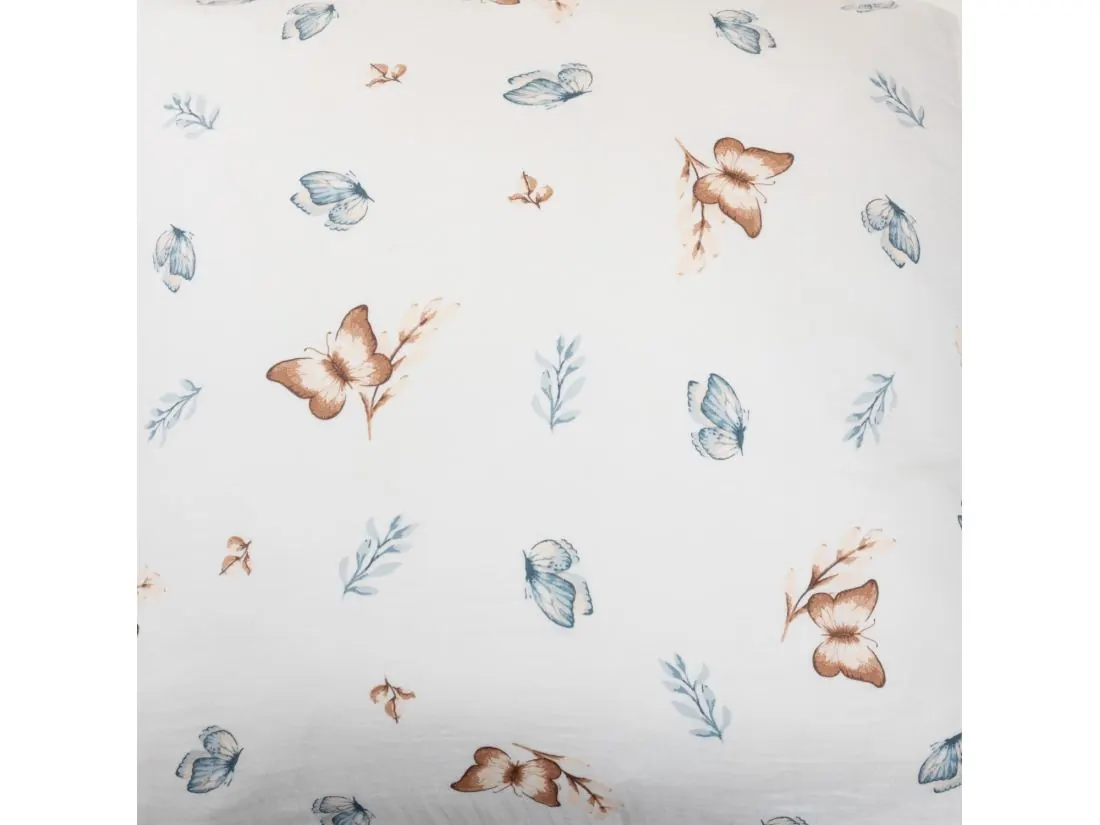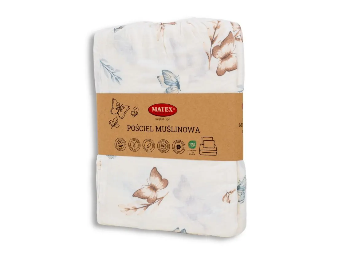 Pościel muślinowa 160x200 cm o romantycznym wzorze, łączącym delikatne motylki i subtelne gałązki na kremowym, lekko ciepłym tle. Motyle występują w dwóch kolorach: niebieskim oraz brązowo-różowym, co nadaje całości lekkości, świeżości i łagodnego uroku. Motyw jest delikatny i nieprzerysowany – rozrzucone, akwarelowe ilustracje nie dominują, lecz harmonijnie dopełniają styl pościeli.