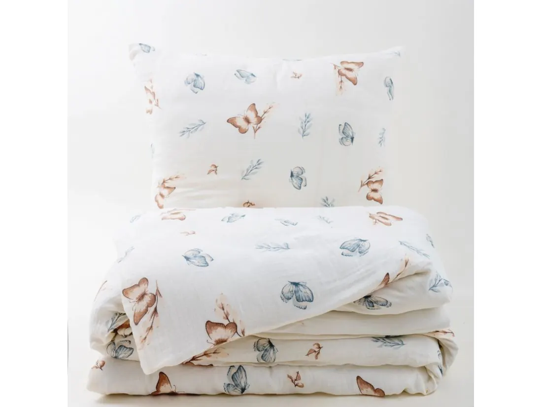 Pościel muślinowa 220x200 cm o romantycznym wzorze, łączącym delikatne motylki i subtelne gałązki na kremowym, lekko ciepłym tle. Motyle występują w dwóch kolorach: niebieskim oraz brązowo-różowym, co nadaje całości lekkości, świeżości i łagodnego uroku. Motyw jest delikatny i nieprzerysowany – rozrzucone, akwarelowe ilustracje nie dominują, lecz harmonijnie dopełniają styl pościeli.