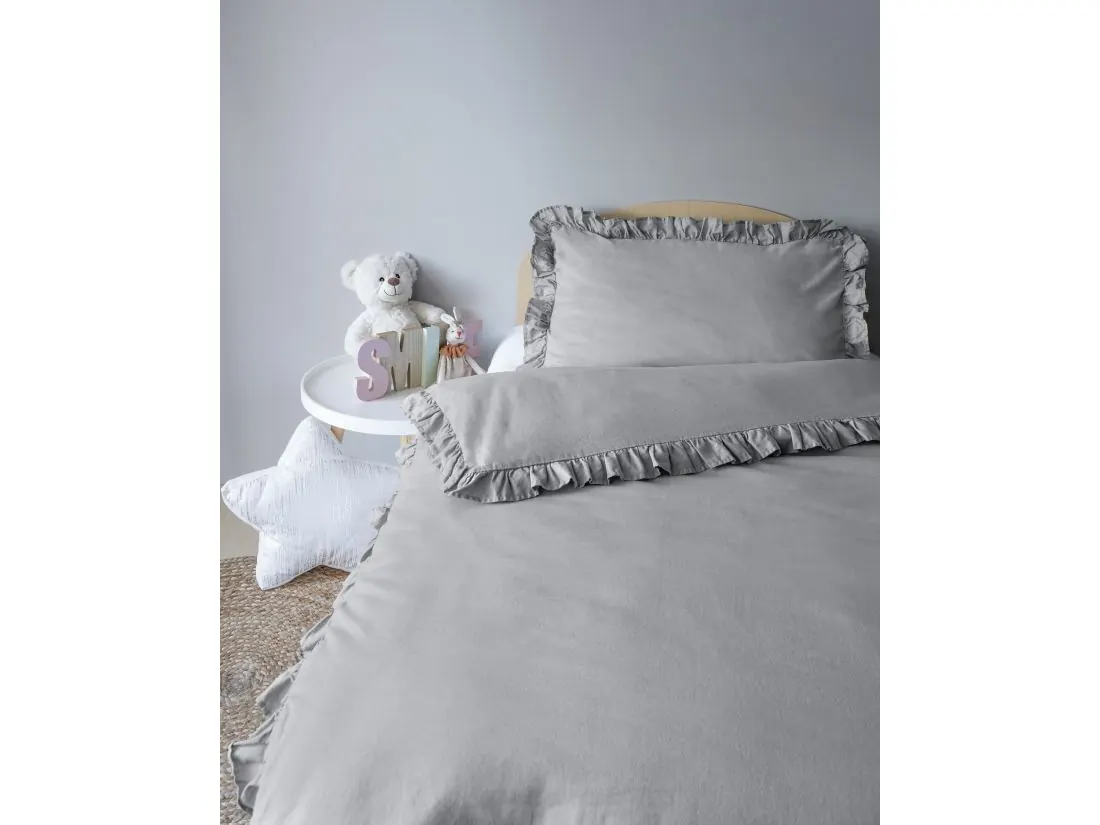 Eleganckie falbanki dodają uroku i nadają pościeli subtelny, klasyczny wygląd, doskonale komponując się z aranżacją dziecięcego pokoju. Dzięki hipoalergicznej i wolnej od szkodliwych substancji bawełnie, pościel jest całkowicie bezpieczna dla niemowląt i małych dzieci, zapewniając im zdrowy i komfortowy sen. Praktyczne zapięcie na guziki ułatwia zmianę pościeli, zapewniając wygodę użytkowania.
