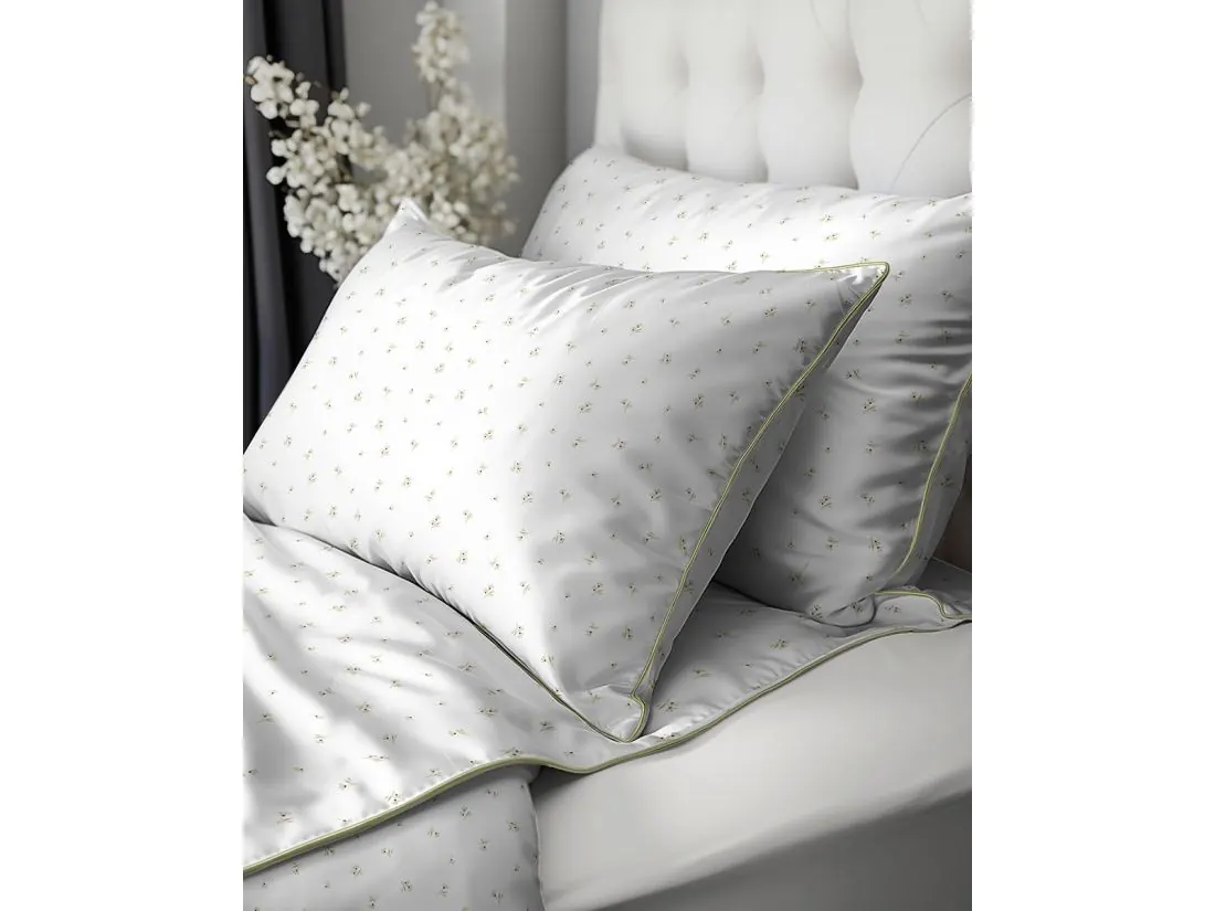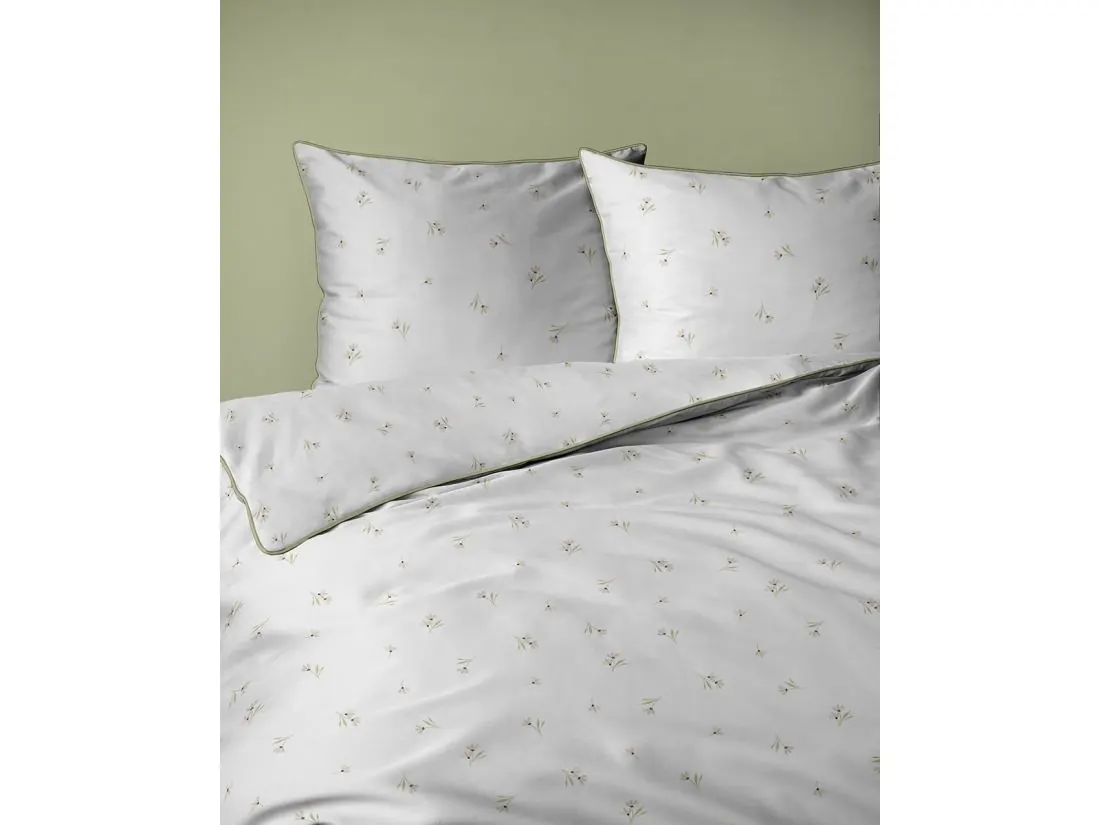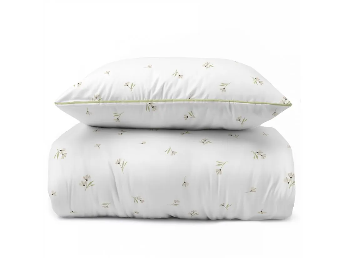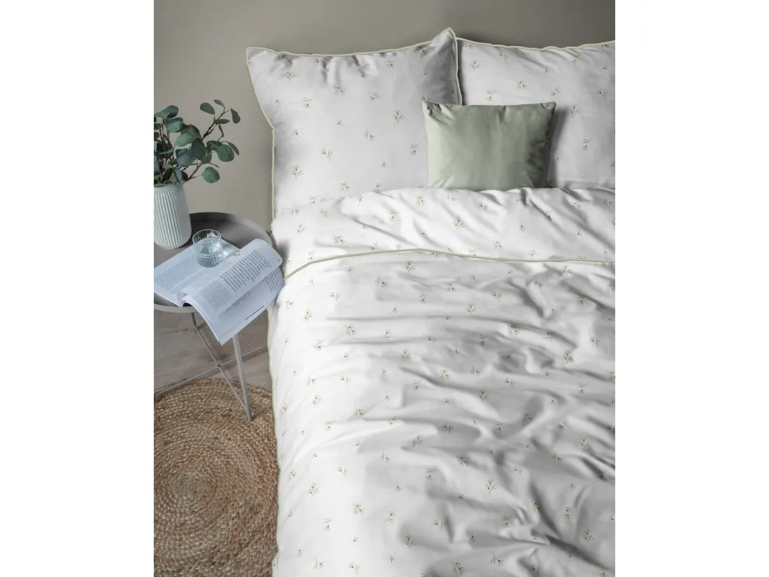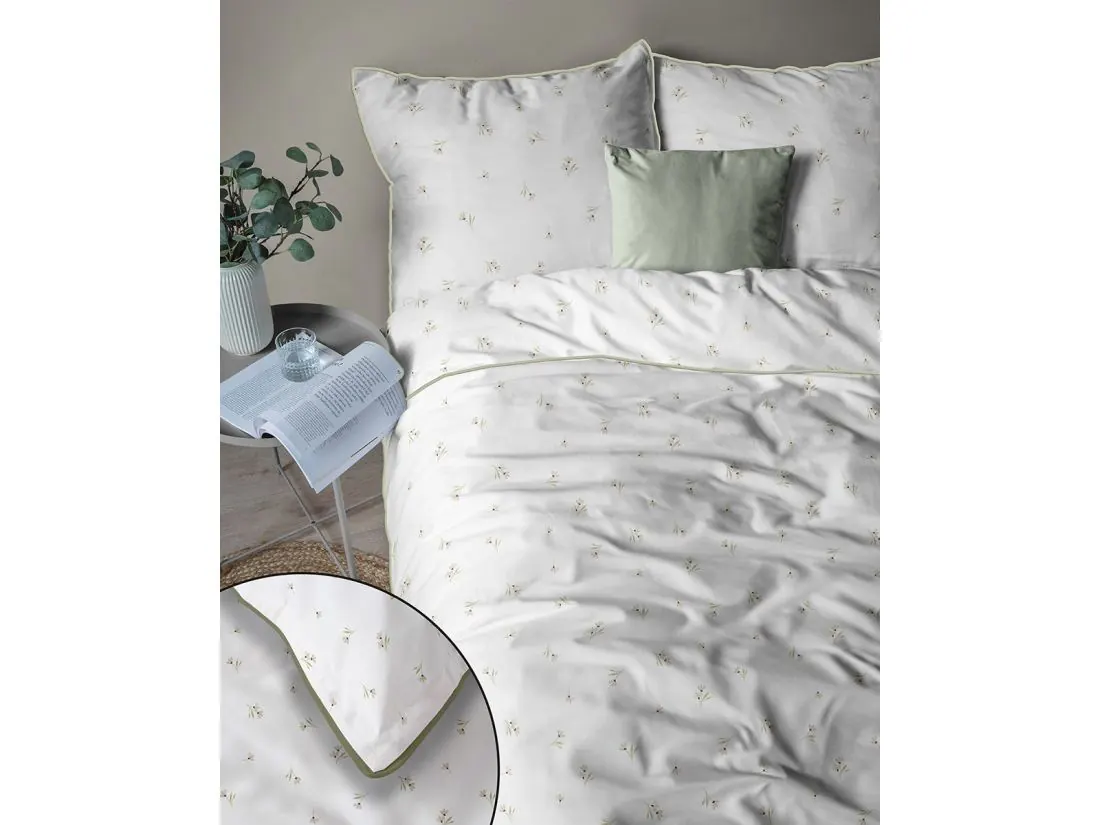 Ta wyjątkowa pościel perkalowa z kolekcji Lame Percale urzeka swoją powściągliwością i czystością formy. Kompozycja składa się z bardzo drobnych, pojedynczych kwiatuszków, które subtelnie nakrapiają czyste, białe tło. To propozycja stworzona dla osób pragnących wprowadzić do sypialni maksymalny spokój i optyczną przestrzeń na powierzchni wypoczynkowej o wymiarach 160x200. Unikalnego charakteru nadaje tej pościeli z perkalu oliwkowo-zielona lamówka, która precyzyjnie obramowuje krawędzie, stanowiąc jedyny, wyrazisty akcent kolorystyczny. Dla pełnej estetyki i komfortu, zamek błyskawiczny został ukryty pod specjalną plisą, co sprawia, że jest on całkowicie niewidoczny i niewyczuwalny podczas snu.