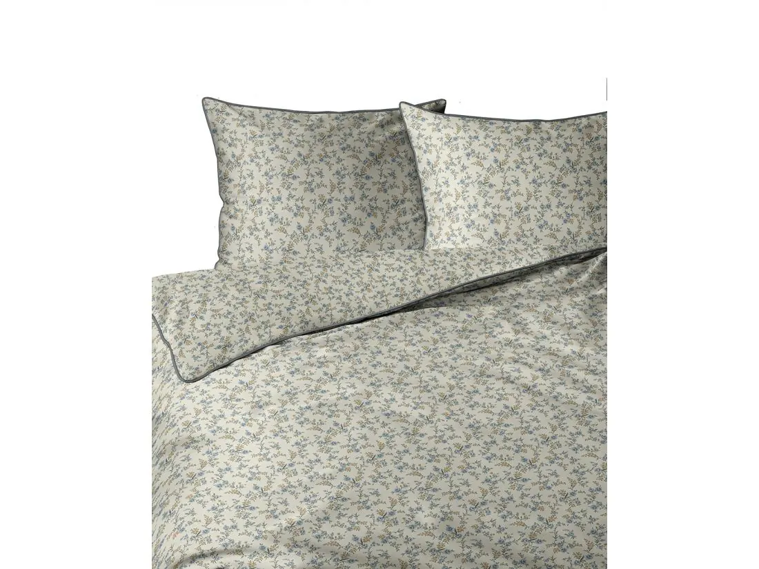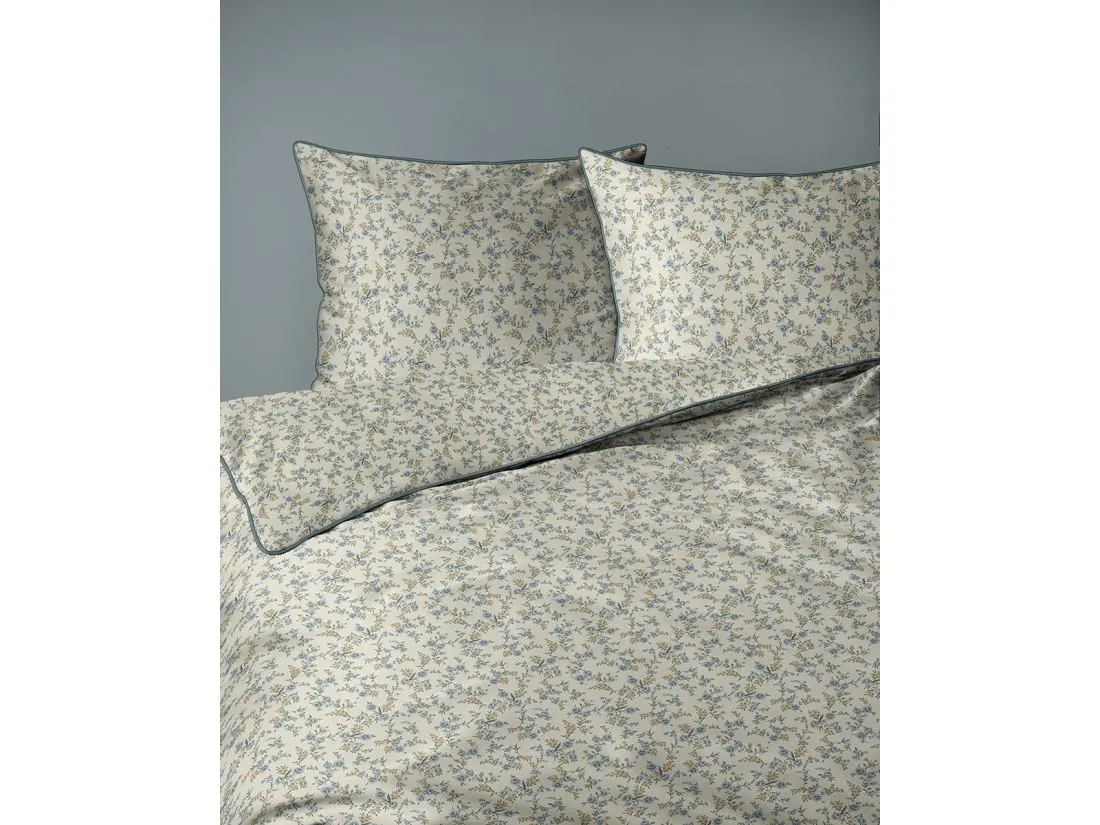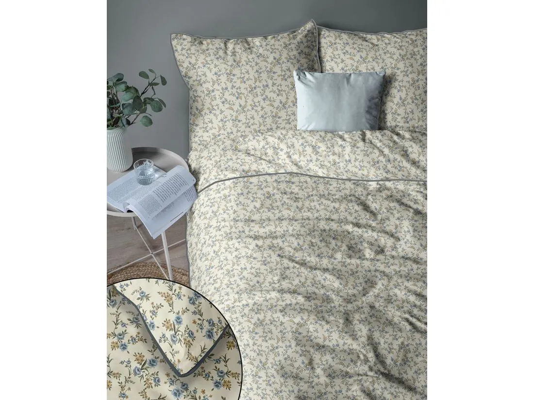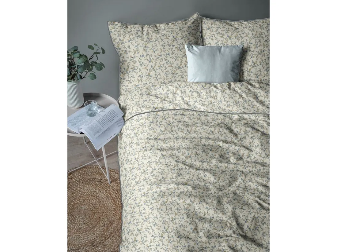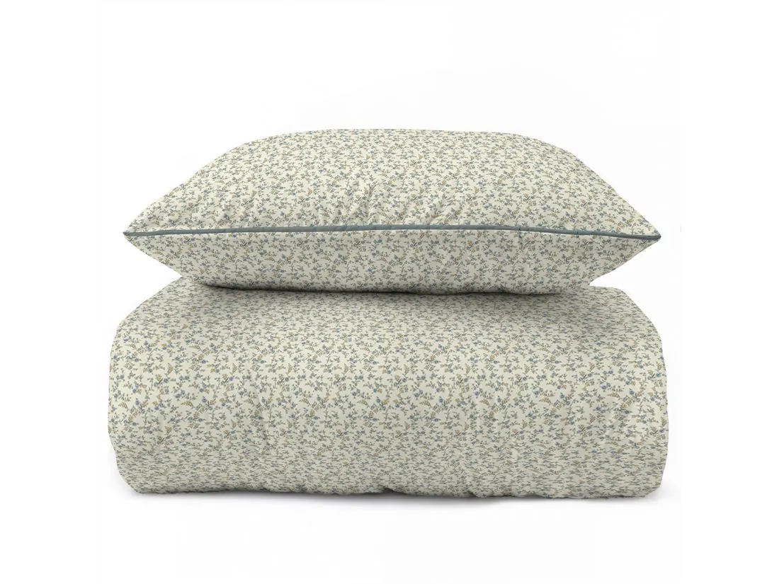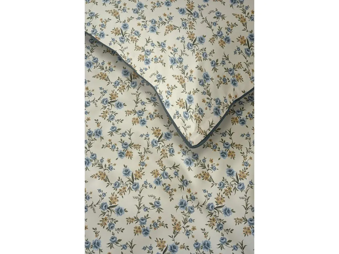 Model ten to hołd dla klasycznego wzornictwa, które nigdy nie wychodzi z mody. Na jasnym, kremowym tle rozsiane są tysiące drobnych kwiatuszków w odcieniach błękitu i zieleni, tworząc gęstą, niezwykle estetyczną łączkę na całej powierzchni 220x200. Wyjątkowość tej pościeli perkalowej podkreśla kontrastująca, ciemnozielona lamówka, która nadaje poszewkom geometryczny ład i elegancję. Projekt został przemyślany tak, aby zamek błyskawiczny ukryty pod plisą był niewyczuwalny, co pozwala w pełni cieszyć się miękkością tkaniny.