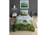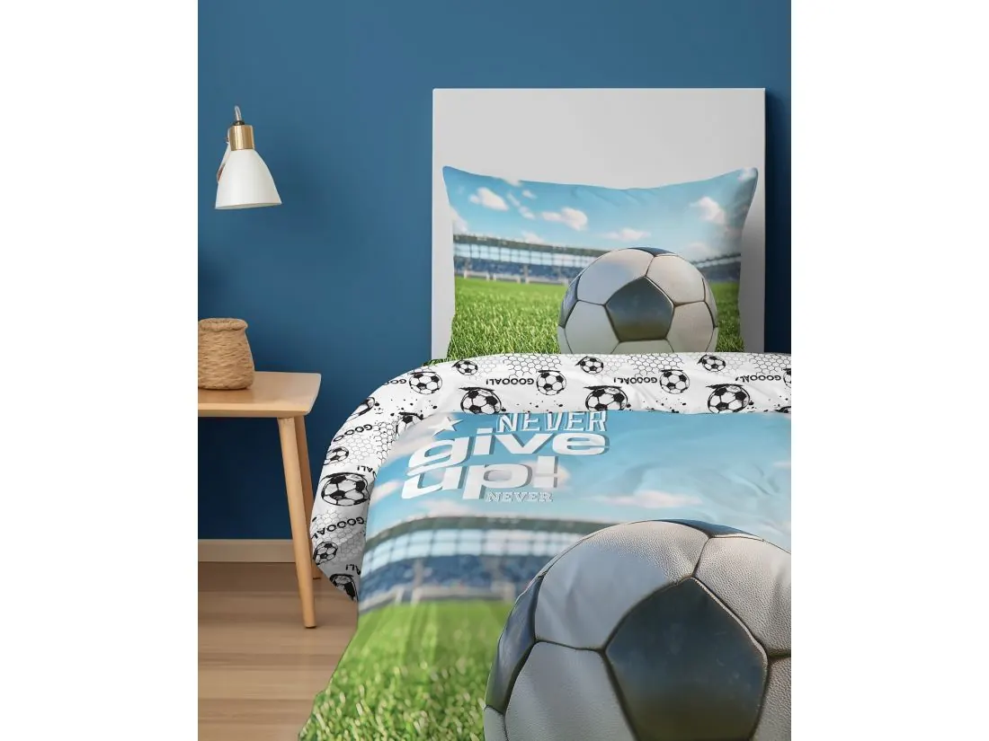 Centralnym elementem kołdry jest realistyczne zdjęcie klasycznej czarno-białej piłki do piłki nożnej, umieszczonej na świeżej, zielonej murawie stadionu skąpanego w dziennym świetle. W górnej części kołdry widnieje duży, motywacyjny napis „NEVER GIVE UP!”, który inspiruje młodych sportowców do działania i dodaje energii.