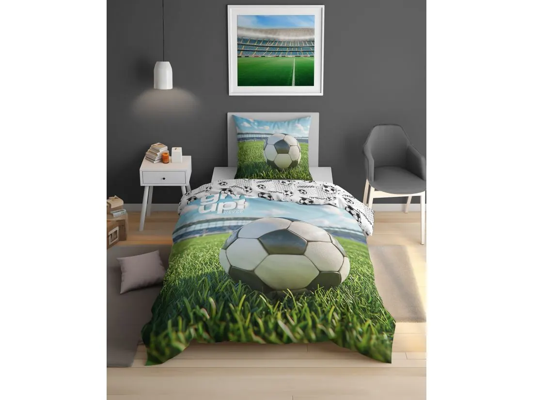 Poduszki powtarzają motyw piłki na tle stadionu. Rewers pościeli zdobi powtarzalny wzór z piłkami i sportowymi akcentami na białym tle, co nadaje całości lekkości i spójności sportowego charakteru.