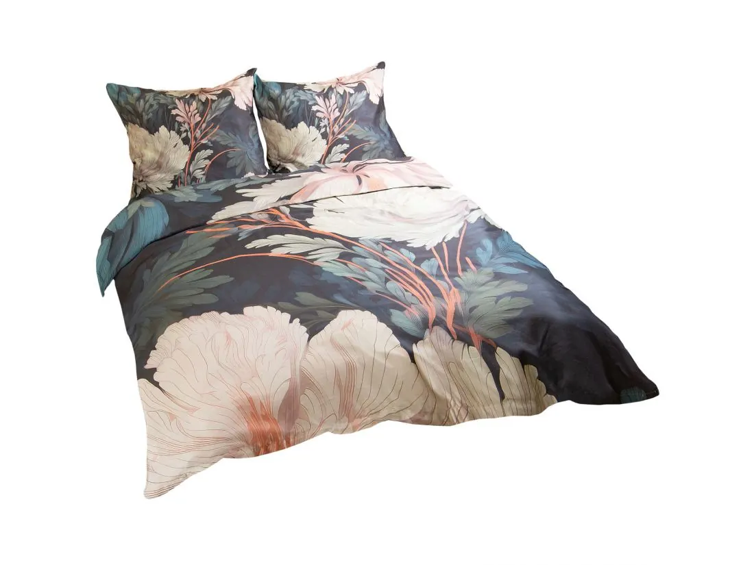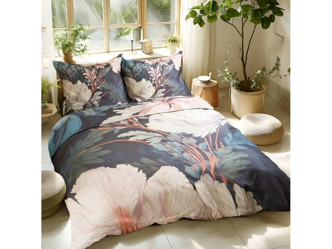 Ta pościel wyróżnia się wyjątkowym wzorem, który natychmiast przyciąga uwagę. Na ciemnym tle wyraźnie odcinają się jasne kwiaty, tworząc elegancki i kontrastowy efekt. Jasne odcienie kwiatów pięknie harmonizują z głębokim kolorem tła, wprowadzając do sypialni odrobinę luksusu i wyrafinowania.