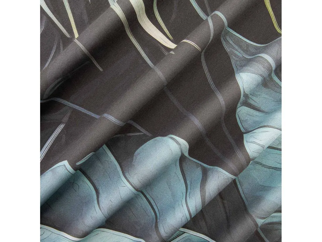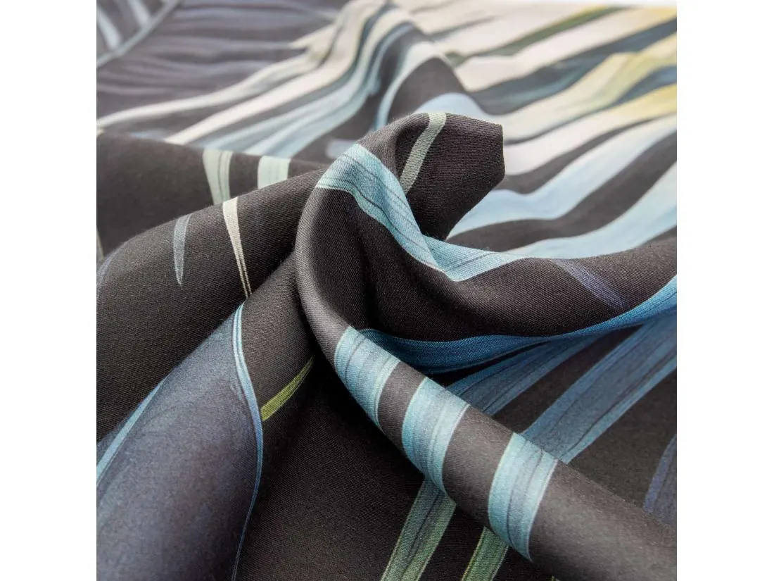 Ta pościel wyróżnia się wyjątkowym wzorem, który od razu przyciąga uwagę. Na ciemnym tle efektownie prezentują się niebieskie i zielone liście, tworząc harmonijną i stylową kompozycję. Intensywne kolory liści pięknie kontrastują z głębokim odcieniem tła, wprowadzając do sypialni elegancję i nutę natury.
