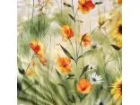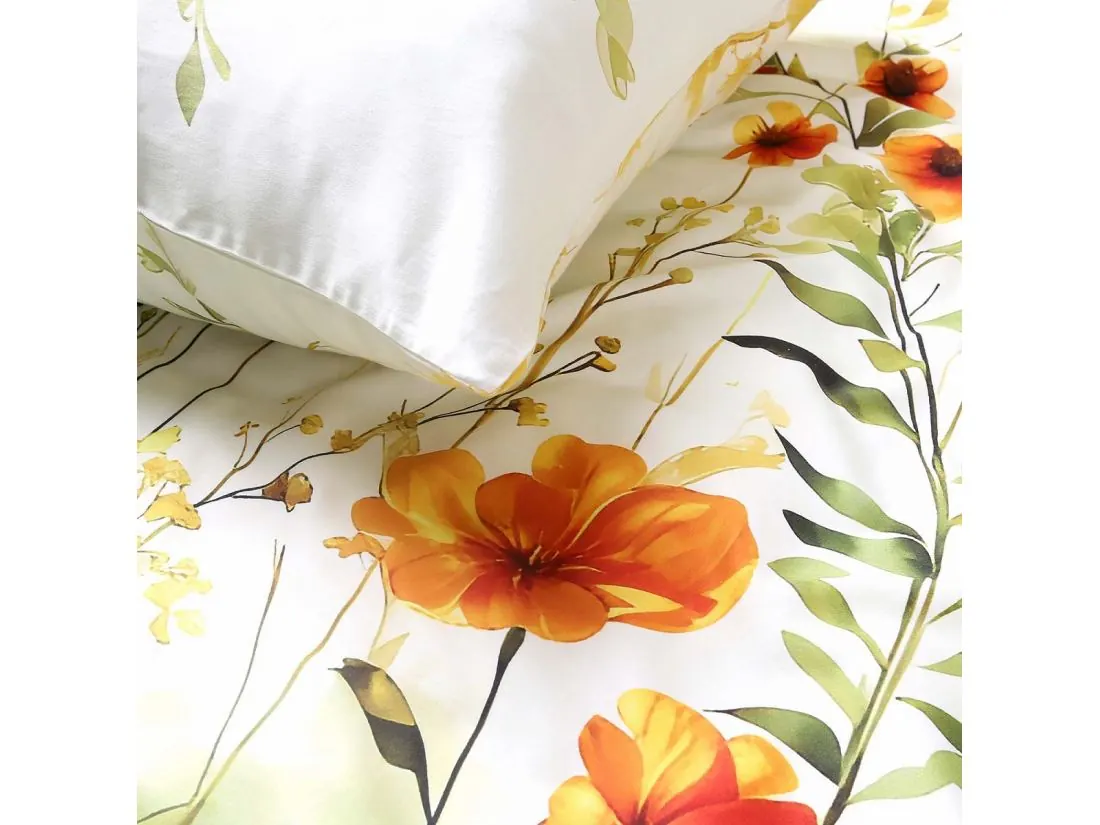 Przedstawiamy komplet pościeli z ekskluzywnej kolekcji SATYNLOVE PREMIUM. Wzór na tkaninie to delikatna, artystyczna kompozycja pól łąkowych, w której pierwsze skrzypce grają słoneczniki o ciepłych pomarańczowo-żółtych płatkach. Kwiaty otoczone są mniejszą roślinnością w odcieniach czerwieni i żółci oraz zielonymi liśćmi i trawami, a całość została osadzona na uspokajającym, kremowym tle.