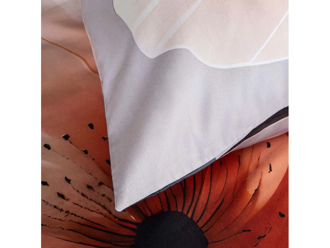 Nowoczesny wzór tej pościeli przyciąga uwagę odważną i energetyzującą kompozycją. Duże, pomarańczowe kwiaty rozkwitają na tle jasnoszarej tkaniny, nadając wnętrzu świeżości i dynamiki. Ich intensywność przełamują kontrastujące, granatowe liście, które wprowadzają głębię i elegancję, tworząc wyjątkowo efektowną, a jednocześnie spójną całość. To propozycja idealna dla osób, które cenią nowoczesny design i pragną dodać sypialni wyrazistego charakteru. Za sprawą nowoczesnej technologii druku cyfrowego wzór zachowuje swoje intensywne kolory i detale nawet po wielokrotnym praniu. Praktyczny zamek błyskawiczny ukryty pod estetyczną plisą zapewnia nie tylko wygodę, ale i eleganckie wykończenie.