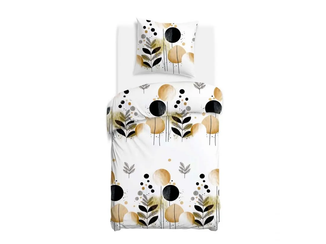 Wyobraź sobie pościel, która wnosi do sypialni odrobinę luksusu prosto z natury – czarne, smukłe liście tańczą obok złotych, musztardowych okręgów na białym tle, jakby jesienne słońce przeświecało przez gałęzie. To propozycja z cenionej kolekcji Satynlove, stworzona z myślą o użytkownikach, dla których priorytetem jest połączenie estetyki nature-inspired z bezkompromisową jakością naturalnych tkanin.