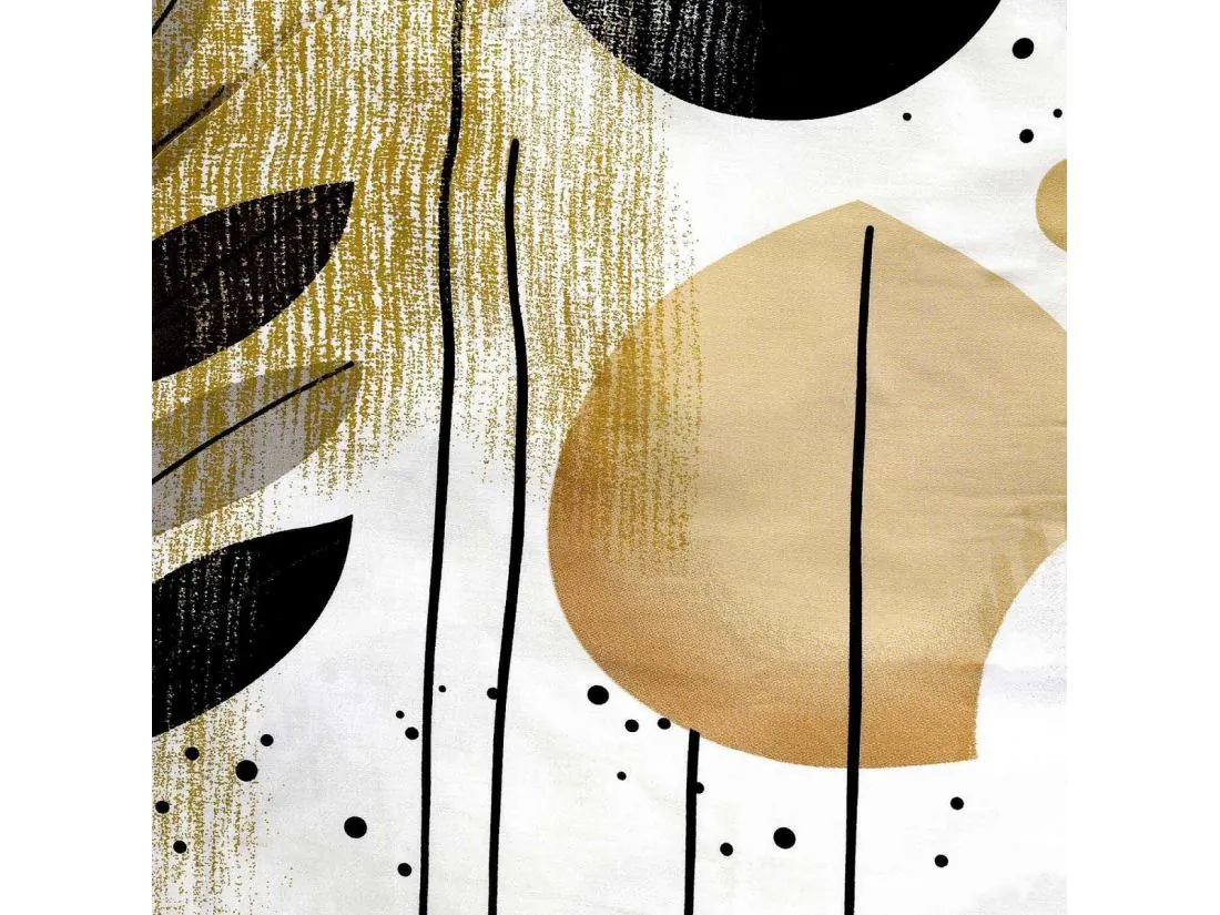 Te eleganckie czarne liście, przeplatane ciepłymi złotymi plamami i subtelnymi kropkami écru, tworzą lekką, artystyczną mozaikę – nie sztywną grafikę, a swobodny mix, który ożywa na połyskującej satynie bawełnianej. Wygląda jak ręcznie malowany szkic z nutą nowoczesności, dodając Twojej sypialni przytulnego ciepła i elegancji bez przesady – idealny na leniwe poranki z kawą w łóżku.