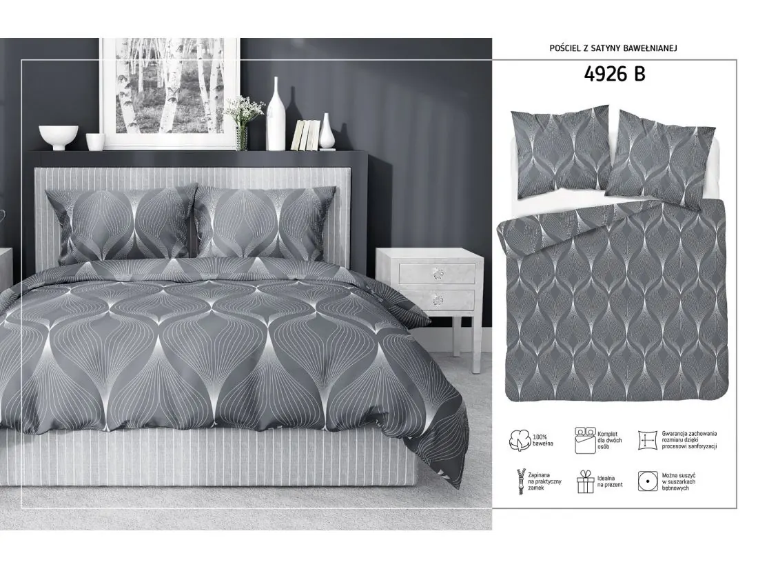 Komplet pościeli z satyny bawełnianej zachwyca wyjątkowym stylem i subtelną kolorystyką, sprawia, że każda noc spędzona w jej otoczeniu staje się niezapomniana. Modny a jednocześnie elegancki wzór oraz ciekawy kolor pościeli przyciąga wzrok i intryguje. Stylistyka stanowi harmonijne połączenie tradycji i nowoczesności, tworząc niezwykle elegancką kompozycję, która nadaje sypialni niepowtarzalny charakter i wyjątkowy urok.