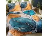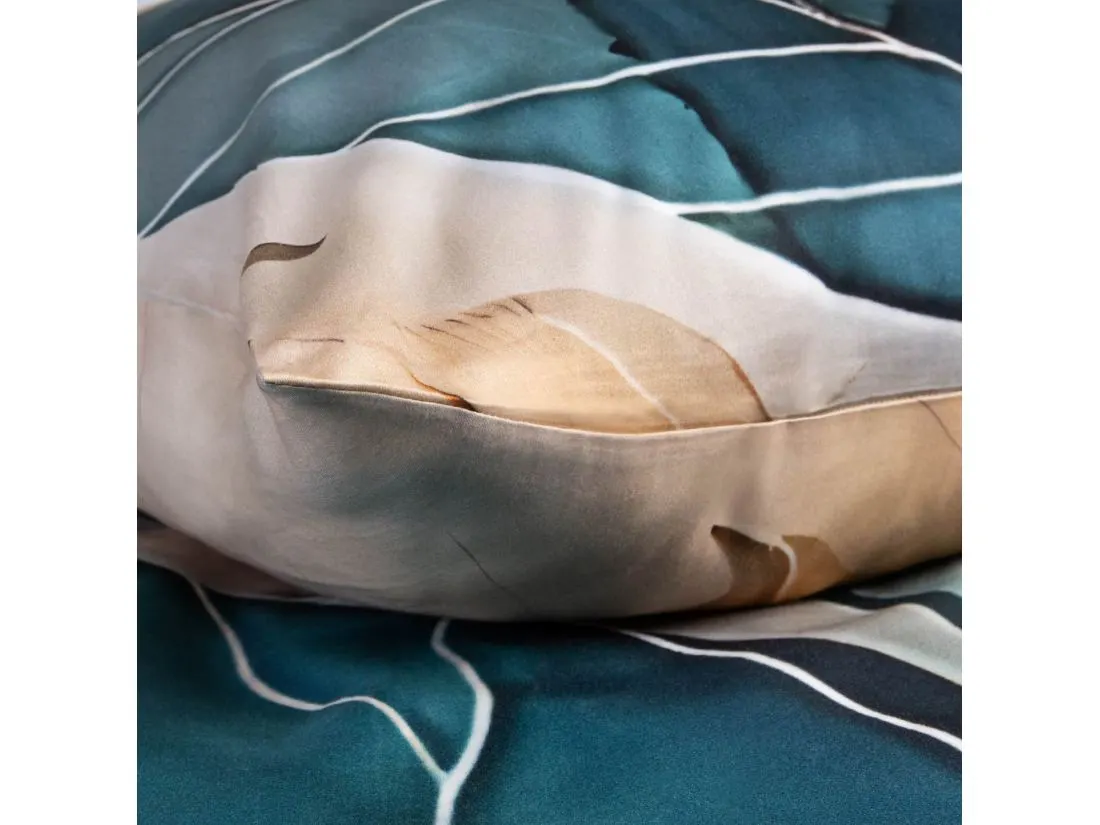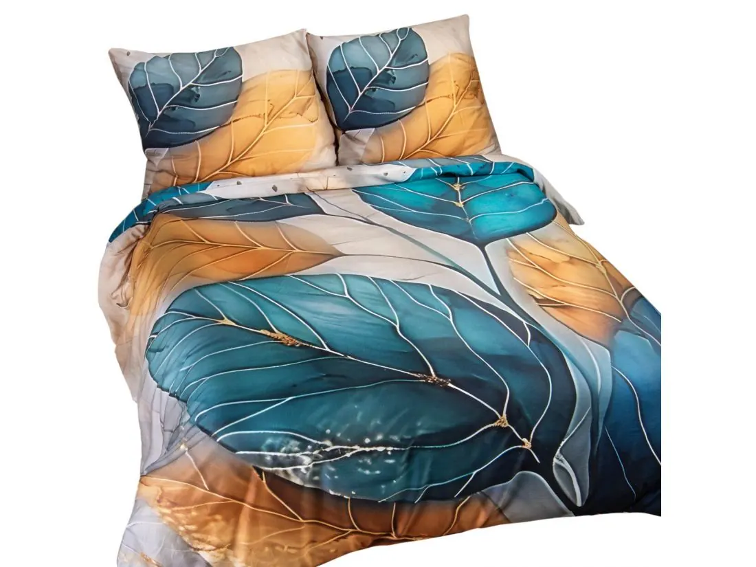 Wzór pościeli wyróżnia się nowoczesną estetyką inspirowaną naturą. Duże, graficzne liście w odcieniach turkusu, głębokiego granatu i złota tworzą wyrazistą, artystyczną kompozycję, która przyciąga wzrok i nadaje wnętrzu dynamicznego, a zarazem ciepłego charakteru. Ten odważny motyw idealnie łączy nowoczesny styl z naturalnymi akcentami, tworząc przestrzeń sprzyjającą zarówno relaksowi, jak i estetycznej przyjemności. Zaawansowana technologia druku cyfrowego gwarantuje wysoką jakość detali i trwałość kolorów, nawet po wielu praniach. Praktyczny zamek błyskawiczny, dyskretnie ukryty pod elegancką plisą, dopełnia całości, zapewniając wygodę i estetykę.