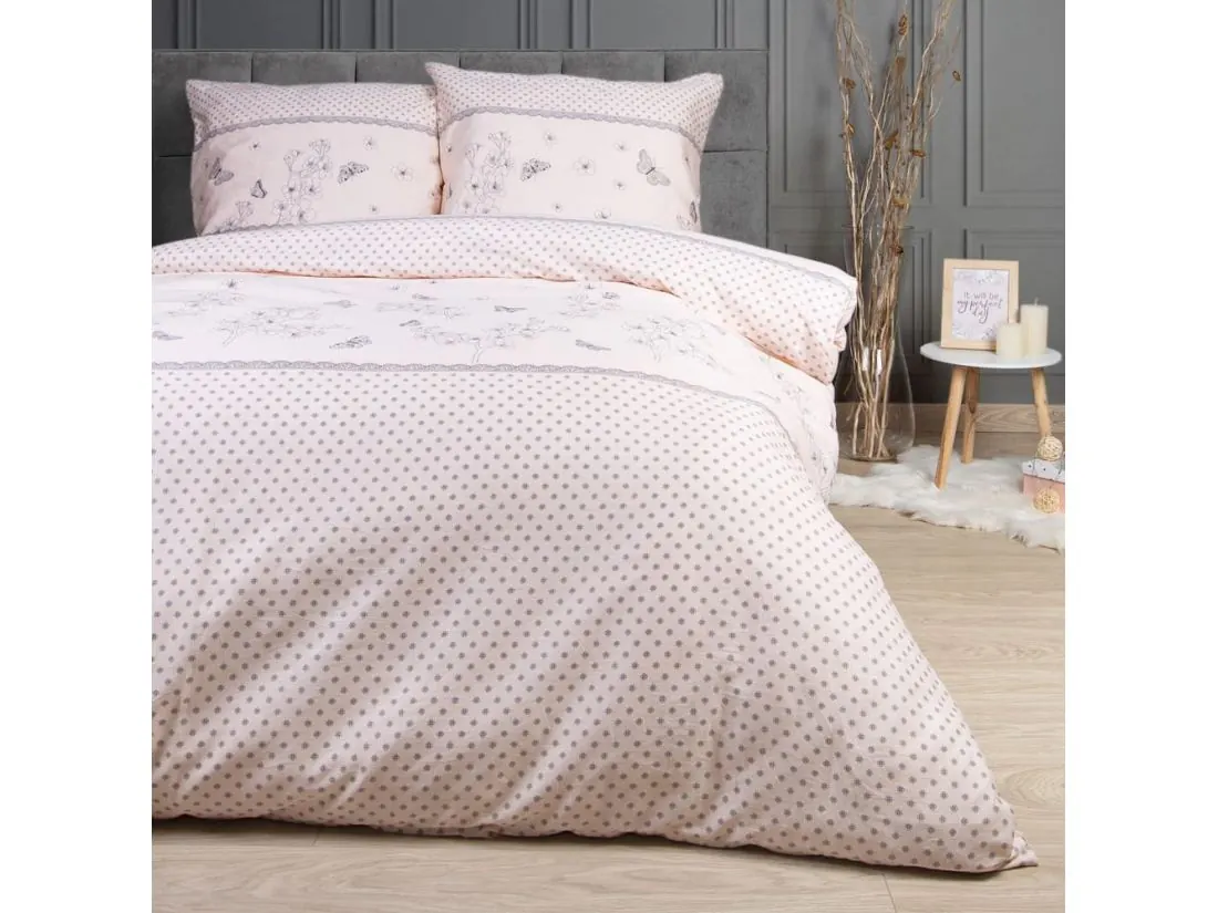 Pościel z satyny bawełnianej w rozmiarze 160x200 wzór 1515/1, została wykonana ze 100 % bawełny, barwienie pigmentowe, poddana procesowi merceryzacji i gładzenia (kalandrowania), w wyniku czego pościel jest miękka, miła oraz delikatna w dotyku. Uroczy wzór motylków w otoczeniu drobnych kwiatuszków na jasno różowym tle intryguje oraz przyciąga wzrok. Pościel która nada niecodzienny charakter oraz wyjątkowy urok każdej sypialni, tak aby każda noc spędzona w pościeli była wyjątkowa.