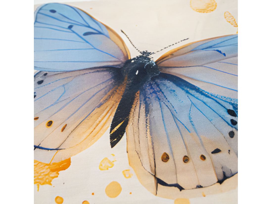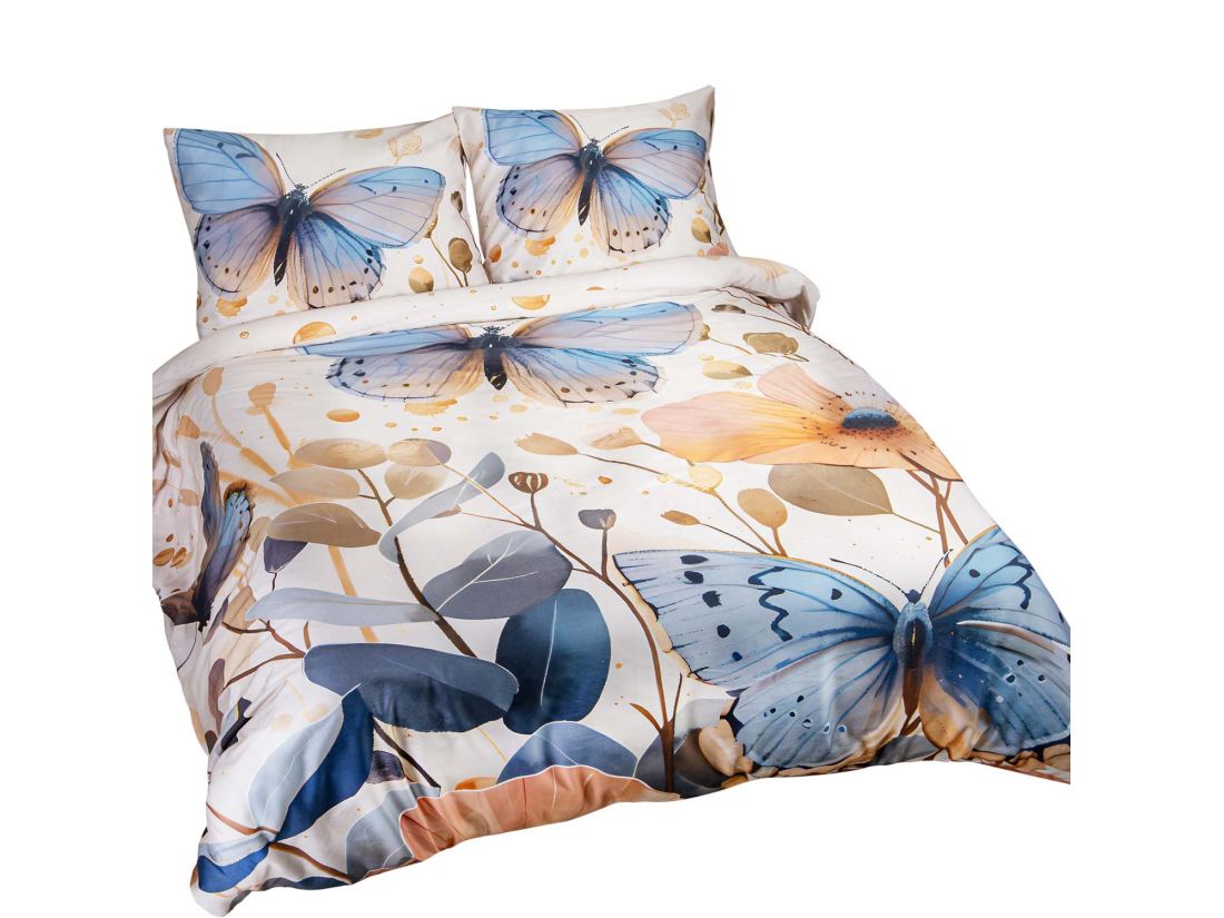 Wzór pościeli urzeka delikatnością i romantyzmem. Na tle w jasnych odcieniach kremu i ciepłego beżu rozpościera się subtelna, botaniczna kompozycja z pastelowymi kwiatami i finezyjną roślinnością. Jej centralnym motywem są realistycznie odwzorowane niebieskie motyle, które przywodzą na myśl letni ogród pełen spokoju i lekkości. Harmonijne zestawienie kolorów i detali wnosi do wnętrza świeżość, optycznie je rozjaśniając i nadając mu łagodny, relaksujący charakter. Dzięki wykorzystaniu druku cyfrowego każdy detal motywu zachwyca precyzją i trwałością – kolory pozostają intensywne nawet po wielu praniach. Dyskretny zamek błyskawiczny ukryty pod elegancką plisą to praktyczny dodatek, który nie zakłóca estetyki wzoru.