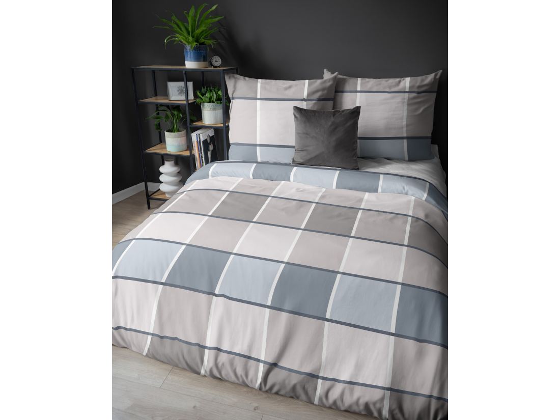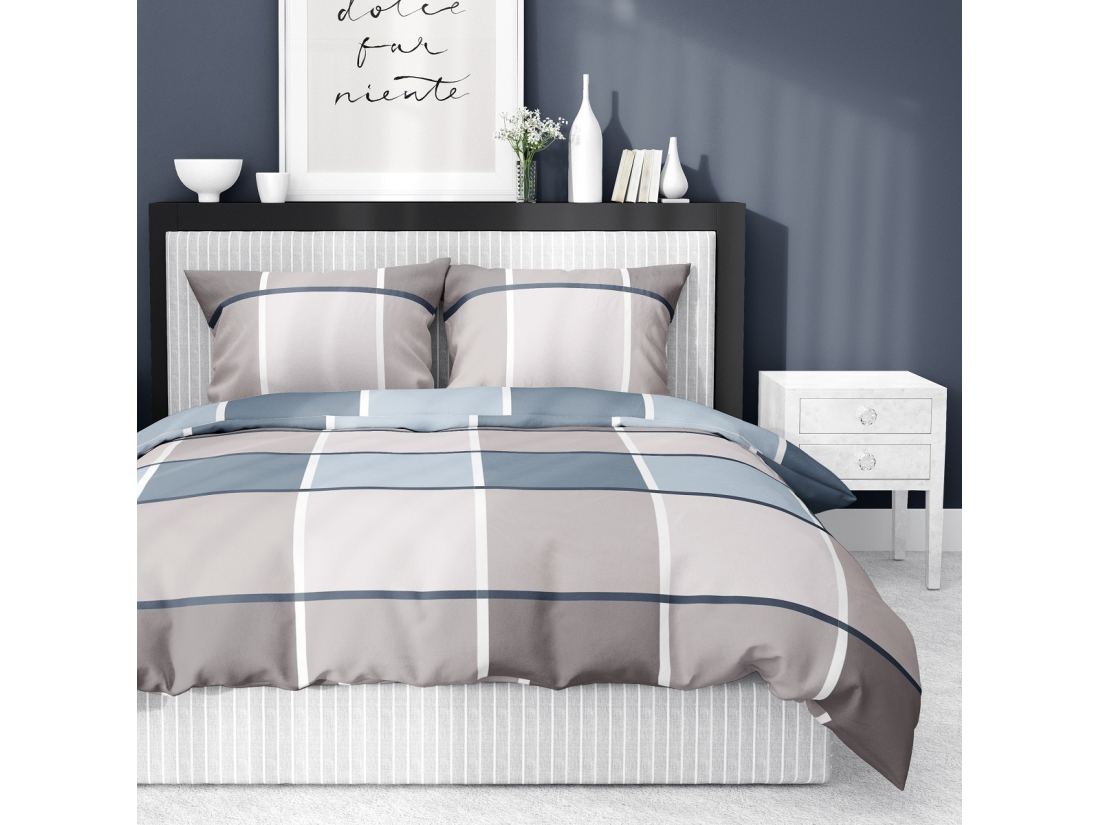 Pościel satynowa 160x200 niebiesko beżowa krata 5544 b
