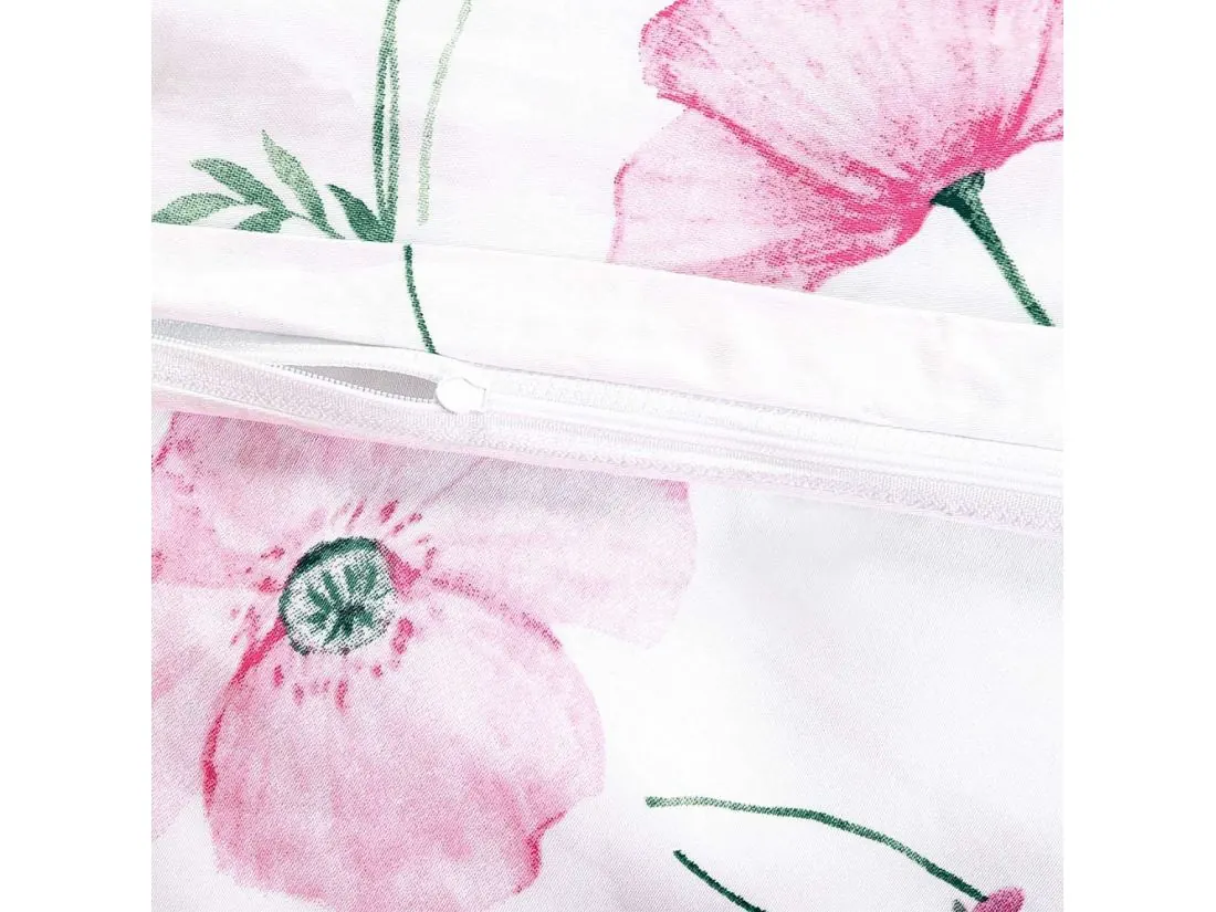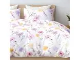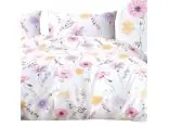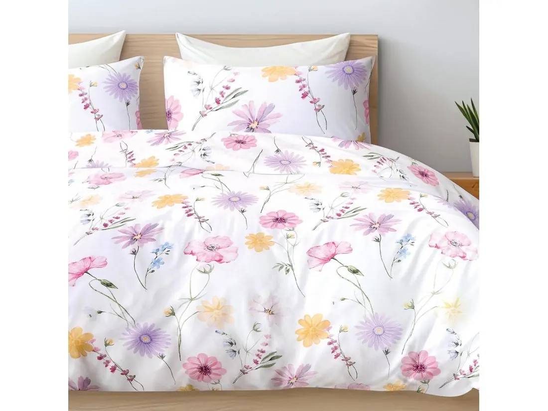 Wzór na tej pościeli satynowej bawełnianej to radosny bukiet wielobarwnych kwiatów – stokrotki i margerytki w pastele fioletu, różu, błękitu i żółci z zielonymi liśćmi, rozsypane na czystym białym tle. To propozycja z cenionej kolekcji Satynlove, stworzona z myślą o użytkownikach, dla których priorytetem jest połączenie estetyki nature-inspired z bezkompromisową jakością naturalnych tkanin.