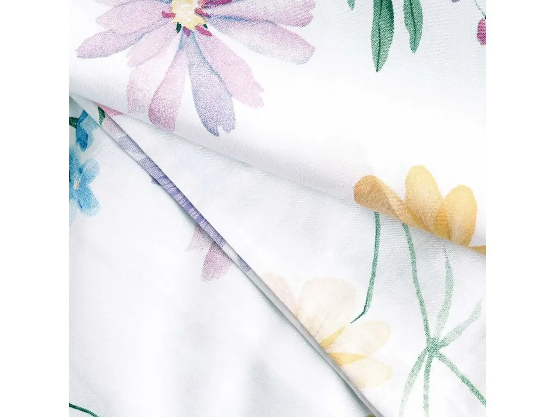 Akwarelowe kwiaty o miękkich krawędziach, z delikatnymi pędami i liśćmi tworzą swobodny, romantyczny wzór – od lawendowych płatków po słoneczne żółte centra. Biała baza podkreśla kolory, dając efekt lekkiej łąki, z połyskiem satyny bawełnianej.