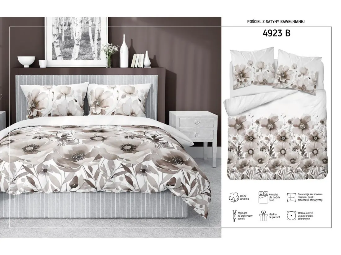 Komplet pościeli z satyny bawełnianej zachwyca wyjątkowym stylem i subtelną kolorystyką, sprawia, że każda noc spędzona w jej otoczeniu staje się niezapomniana. Modny a jednocześnie elegancki wzór oraz ciekawy kolor pościeli przyciąga wzrok i intryguje. Stylistyka stanowi harmonijne połączenie tradycji i nowoczesności, tworząc niezwykle elegancką kompozycję, która nadaje sypialni niepowtarzalny charakter i wyjątkowy urok.