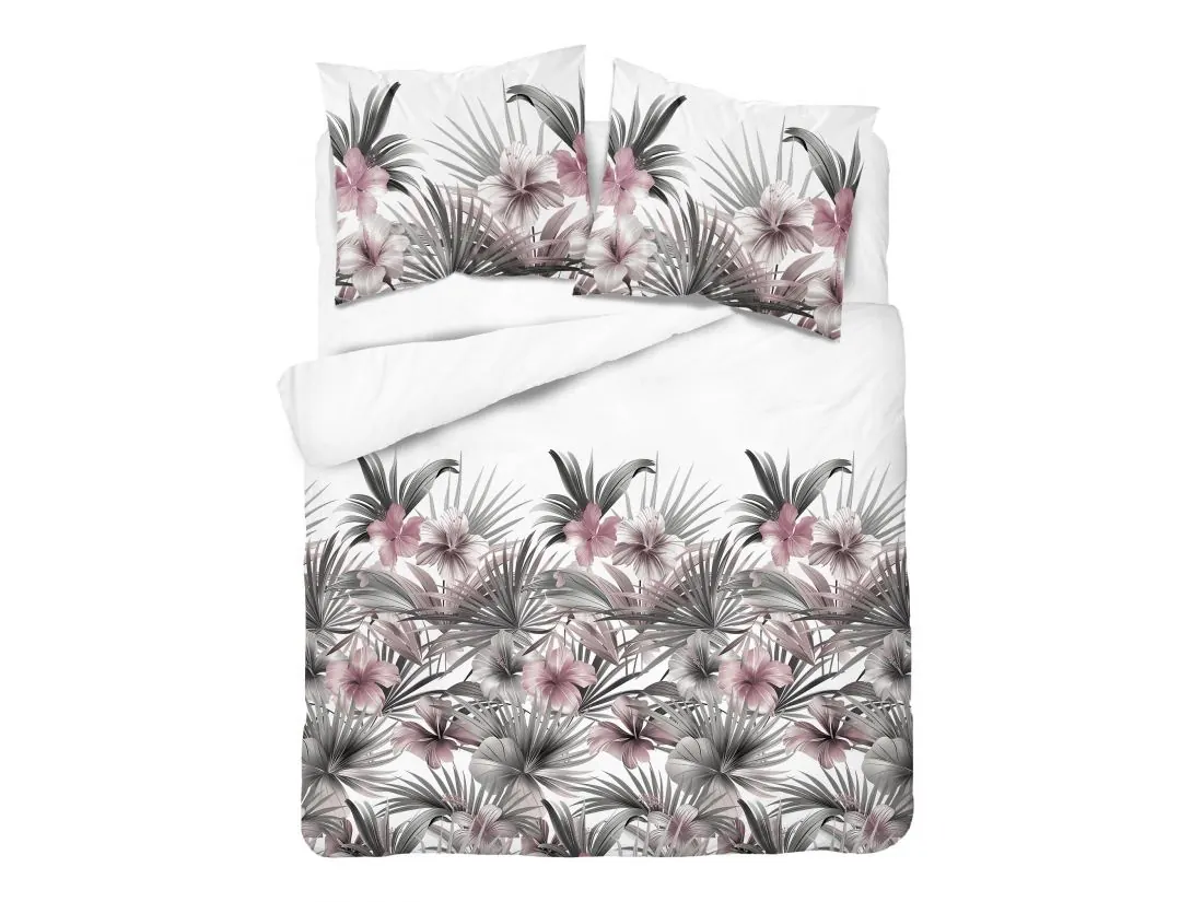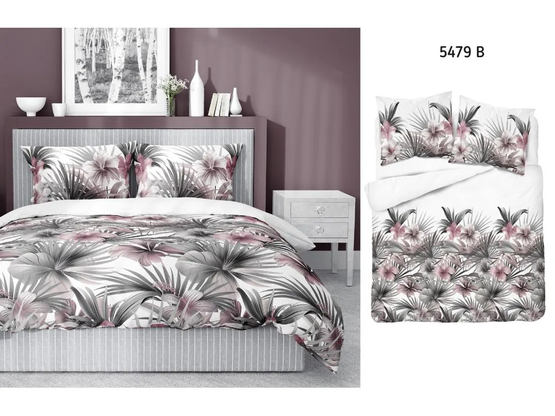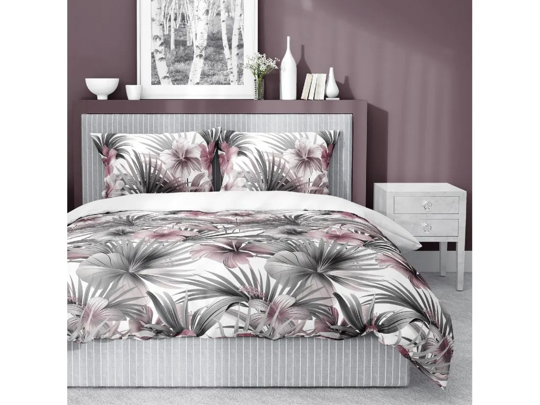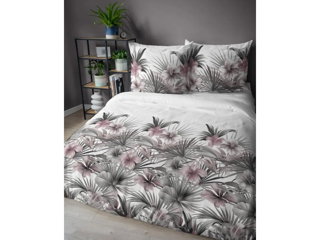 Pościel satynowa 160x200+2/70x80 popielate kwiaty tropikalne wz. 5479 b detexpol