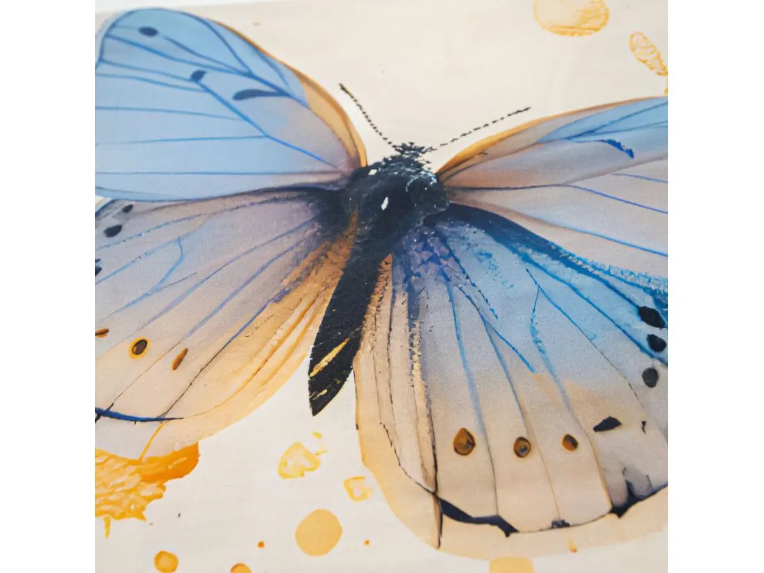 Wzór pościeli urzeka delikatnością i romantyzmem. Na tle w jasnych odcieniach kremu i ciepłego beżu rozpościera się subtelna, botaniczna kompozycja z pastelowymi kwiatami i finezyjną roślinnością. Jej centralnym motywem są realistycznie odwzorowane niebieskie motyle, które przywodzą na myśl letni ogród pełen spokoju i lekkości. Harmonijne zestawienie kolorów i detali wnosi do wnętrza świeżość, optycznie je rozjaśniając i nadając mu łagodny, relaksujący charakter. Dzięki wykorzystaniu druku cyfrowego każdy detal motywu zachwyca precyzją i trwałością – kolory pozostają intensywne nawet po wielu praniach. Dyskretny zamek błyskawiczny ukryty pod elegancką plisą to praktyczny dodatek, który nie zakłóca estetyki wzoru.