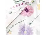 Akwarelowe kwiaty o miękkich krawędziach, z delikatnymi pędami i liśćmi tworzą swobodny, romantyczny wzór – od lawendowych płatków po słoneczne żółte centra. Biała baza podkreśla kolory, dając efekt lekkiej łąki, z połyskiem satyny bawełnianej.