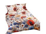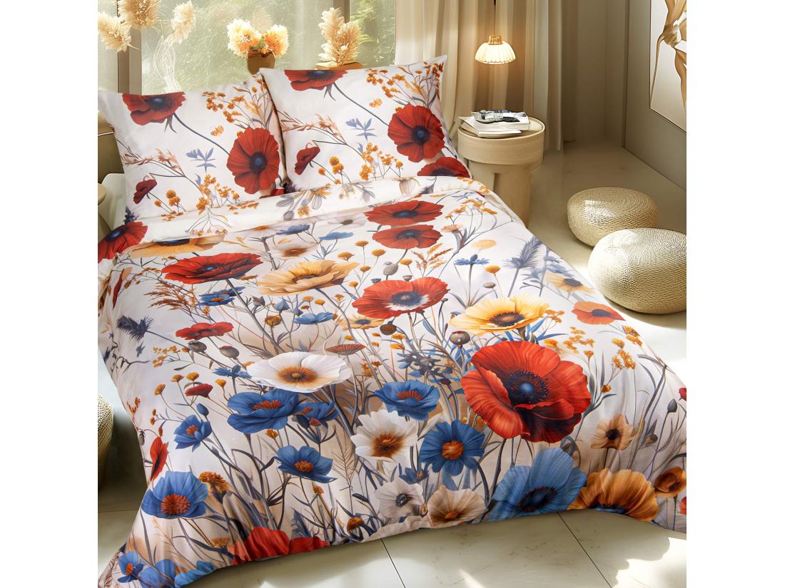 Wzór pościeli inspirowany jest urokiem letniej, kwitnącej łąki. Bogata, wielobarwna kompozycja ożywa dzięki realistycznym czerwonym makom, błękitnym chabrom i drobnym, słonecznym akcentom żółtych kwiatów. Ten energetyczny, florystyczny motyw emanuje radością, świeżością i naturalnym pięknem, wprowadzając do sypialni pozytywną atmosferę oraz poczucie bliskości z naturą. To idealna propozycja dla osób, które cenią przytulne wnętrza pełne życia i koloru. Zastosowanie technologii druku cyfrowego pozwala uchwycić każdy detal roślinnych motywów i gwarantuje trwałość kolorów nawet po wielu praniach. Dyskretnie wszyty zamek błyskawiczny, ukryty pod dekoracyjną plisą, zapewnia wygodę użytkowania i eleganckie wykończenie.