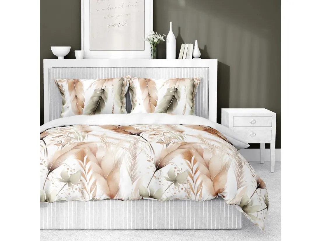 Pościel satynowa 220x200 beżowe piórka na białym tle 5541a