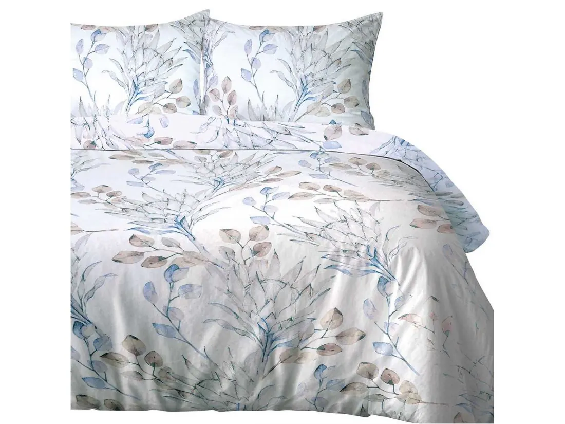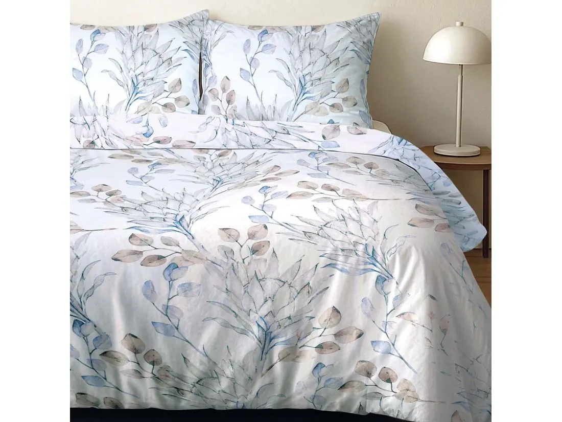 Wzór pościeli to wyrafinowany, akwarelowy print botaniczny z delikatnymi liśćmi i zwiewnymi gałązkami w szerokiej gamie pastelowych błękitów – od lodowatego błękitu po głębszy szaroniebieski – przełamanymi ciepłymi beżami i kremami na czystym, białym tle. To propozycja z cenionej kolekcji Satynlove, stworzona z myślą o użytkownikach, dla których priorytetem jest połączenie estetyki nature-inspired z bezkompromisową jakością naturalnych tkanin.