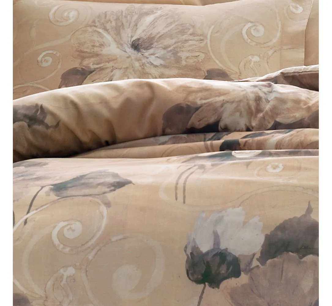 Subtelne połączenie barw w kolorach beżowo szaro kremowym jak również przyciągającym wzorem na pościeli romantycznego kwiatowego motywu tworzy piękną kompozycje, która przypadnie do gustu wszystkim romantykom którzy lubią kwiatowe wzory.