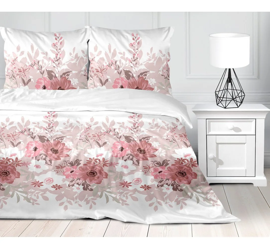 Urocze kwiatki na pościeli w beżowo różowo białej kolorystyce intrygują oraz przyciągają wzrok to połączenie tradycji z nowoczesnością tworzą niezwykłą elegancką kompozycje która nada niecodzienny charakter oraz wyjątkowy urok każdej sypialni.