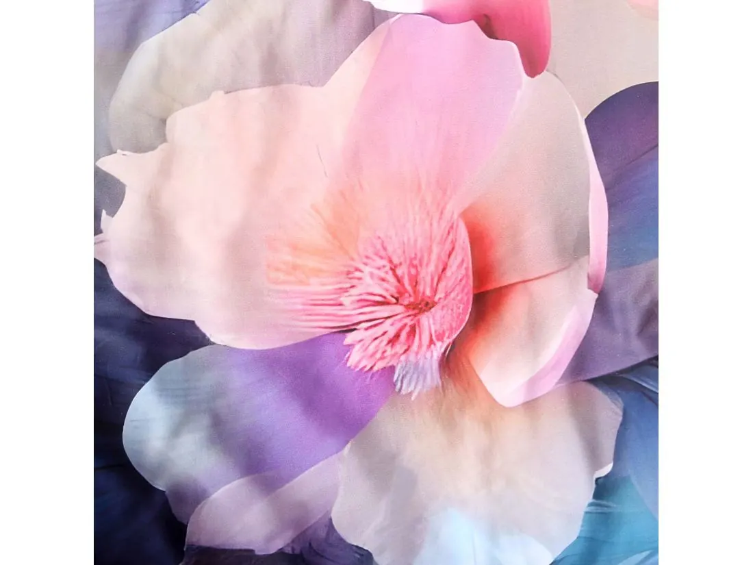 Przedstawiamy komplet pościeli z ekskluzywnej kolekcji SATYNLOVE PREMIUM. Wzór na tkaninie to artystyczny, akwarelowy print z dużymi kwiatami przypominającymi hibiskusy lub piwonie. Płatki w odcieniach bladego różu, koralu i pomarańczy z żółtymi pręcikami posiadają miękkie przejścia kolorystyczne, przenikając się z błękitem i bielą. Całość rozmieszczona asymetrycznie na kremowo-białym tle tworzy efekt głębi i romantycznej świeżości.