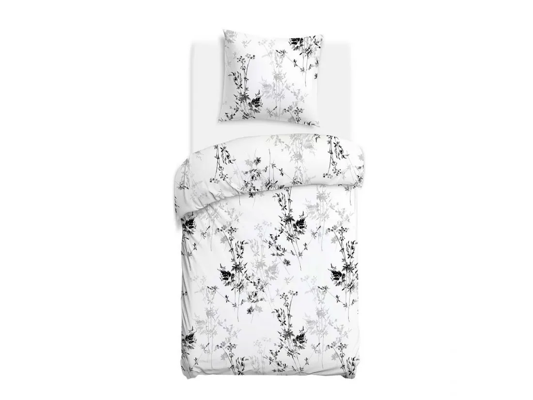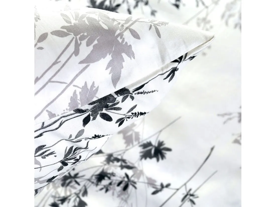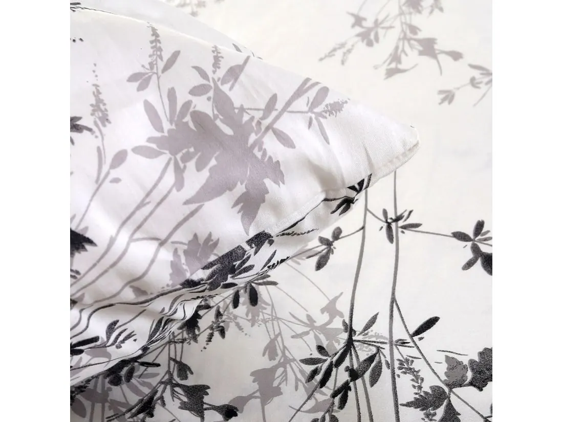 Cienkie, zwiewne pędy z drobnymi kwiatostanami (jak dzika marchew czy kłosy) tworzą eteryczny, minimalistyczny wzór – szarości płynnie przechodzą w głęboką czerń, dając iluzję ruchu i lekkości. Na satynie bawełnianym kolory delikatnie połyskują, zapraszając do spokojnego snu w sypialni z lnianymi zasłonami i drewnianymi akcentami.