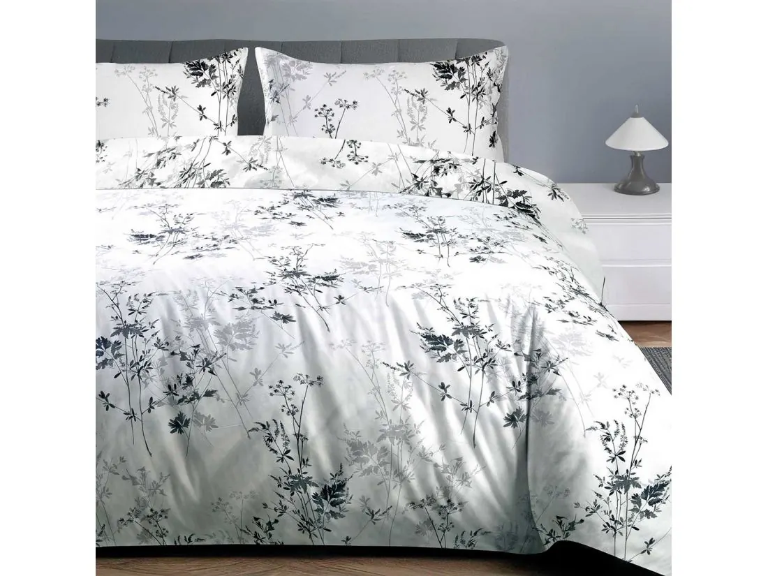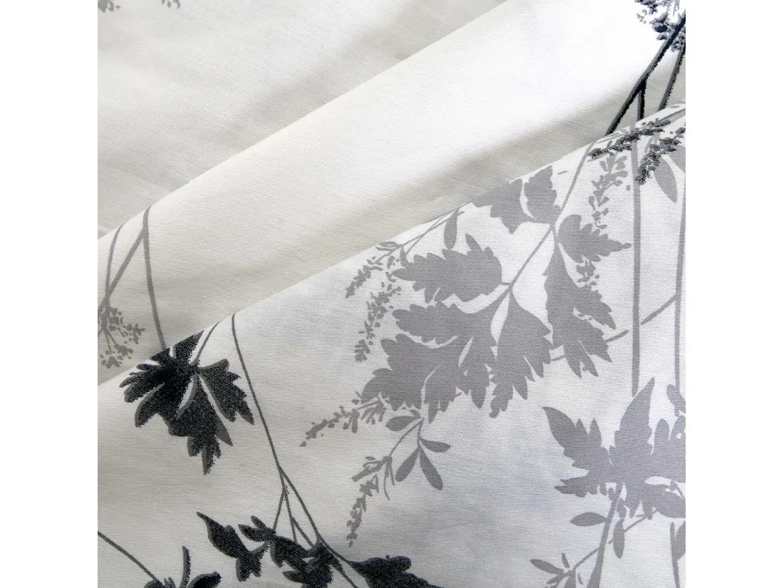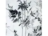 Cienkie, zwiewne pędy z drobnymi kwiatostanami (jak dzika marchew czy kłosy) tworzą eteryczny, minimalistyczny wzór – szarości płynnie przechodzą w głęboką czerń, dając iluzję ruchu i lekkości. Na satynie bawełnianej kolory delikatnie połyskują, zapraszając do spokojnego snu w sypialni z lnianymi zasłonami i drewnianymi akcentami.
