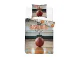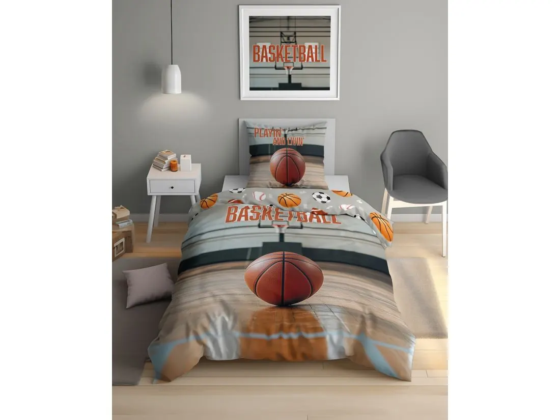 Centralnym elementem kołdry jest duża, realistyczna piłka do koszykówki na tle parkietu i kosza w sali gimnastycznej. W górnej części widoczny jest kontrastowy napis „BASKETBALL”, podkreślający sportowy charakter zestawu. Całość utrzymana jest w naturalnych, realistycznych kolorach brązu, szarości i bieli, które oddają autentyczny klimat hali sportowej.