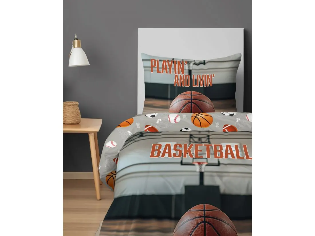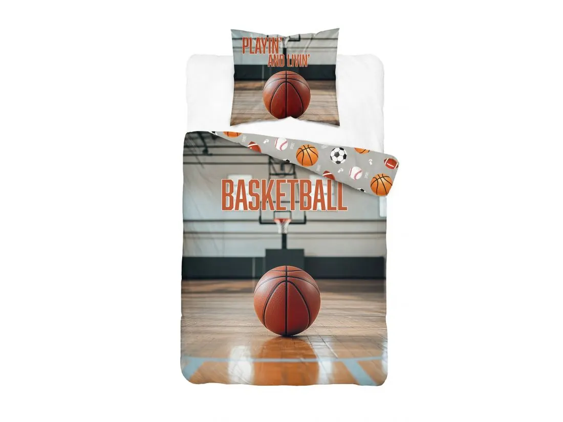 Centralnym elementem kołdry jest duża, realistycznie odwzorowana piłka do koszykówki na tle parkietu i kosza w hali sportowej. W górnej części widoczny jest kontrastowy napis „BASKETBALL”, podkreślający sportowy charakter zestawu. Całość utrzymana jest w naturalnych kolorach brązu, szarości i bieli, oddających autentyczny klimat hali.