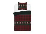 Wzór pościeli to połączenie klasycznej szkockiej kraty w głębokiej czerwieni z barwnymi akcentami ciemnej zieleni i czerni. Zarówno na kołdrze, jak i na poduszkach dominują bordowe pasy tworzące wyrazistą kratę.