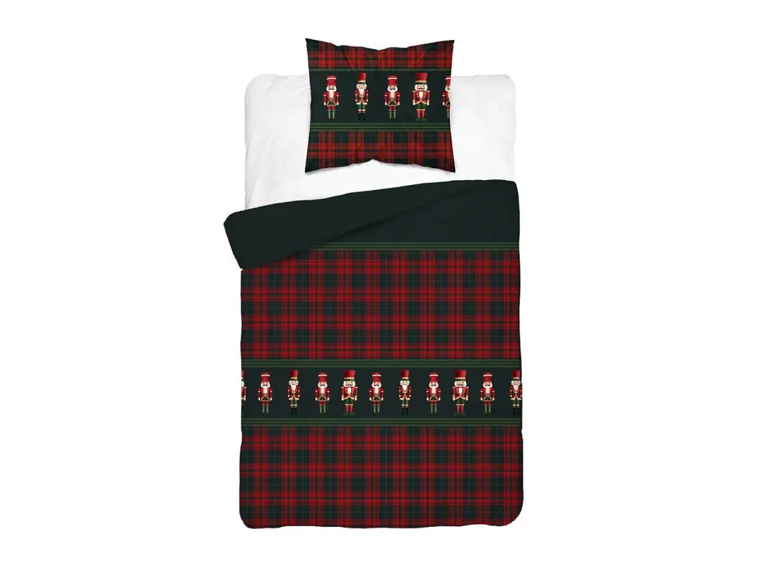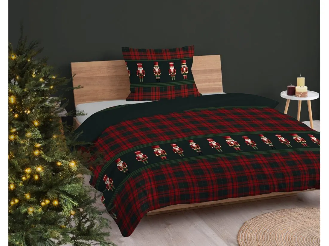 Pościel w klasyczny wzór szkockiej kraty z motywem świątecznych dziadków do orzechów idealnie wkomponuje się w tradycyjne i nowoczesne sypialnie, dodając im ciepła i bożonarodzeniowego uroku. To doskonały wybór na zimowy sezon świąteczny, który wzbogaci aranżację przytulnym, radosnym nastrojem.