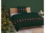 Wzór pościeli to świąteczna, klasyczna krata w zielonych tonacjach, z akcentami czerwieni. Zarówno na poduszkach, jak i kołdrze dominuje szkocki motyw w odcieniach ciemnej zieleni przeplatanej czerwonymi liniami, tworząc geometryczny, przytulny efekt.