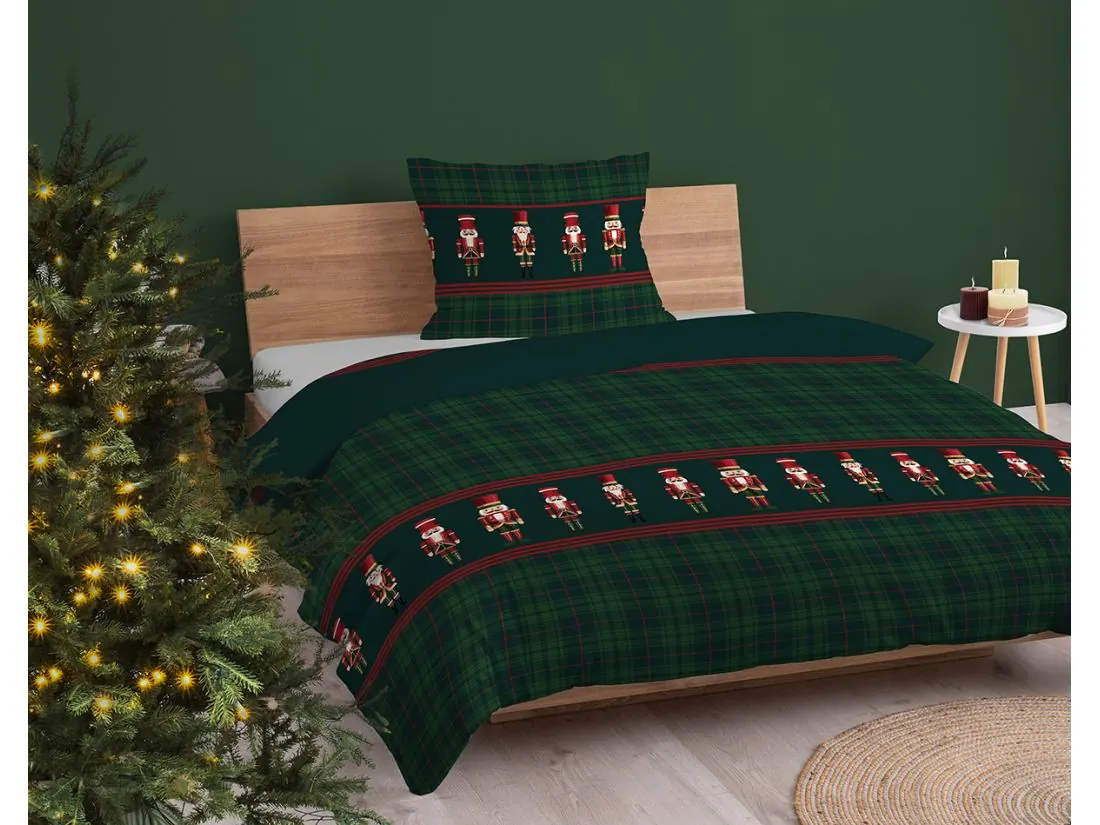 Pościel w klasyczną szkocką kratę z zielonymi tonacjami i czerwonymi akcentami oraz motywem dziadków do orzechów doskonale wkomponuje się w świąteczny wystrój sypialni, tworząc ciepłą i przytulną atmosferę idealną na zimę i Boże Narodzenie.