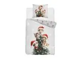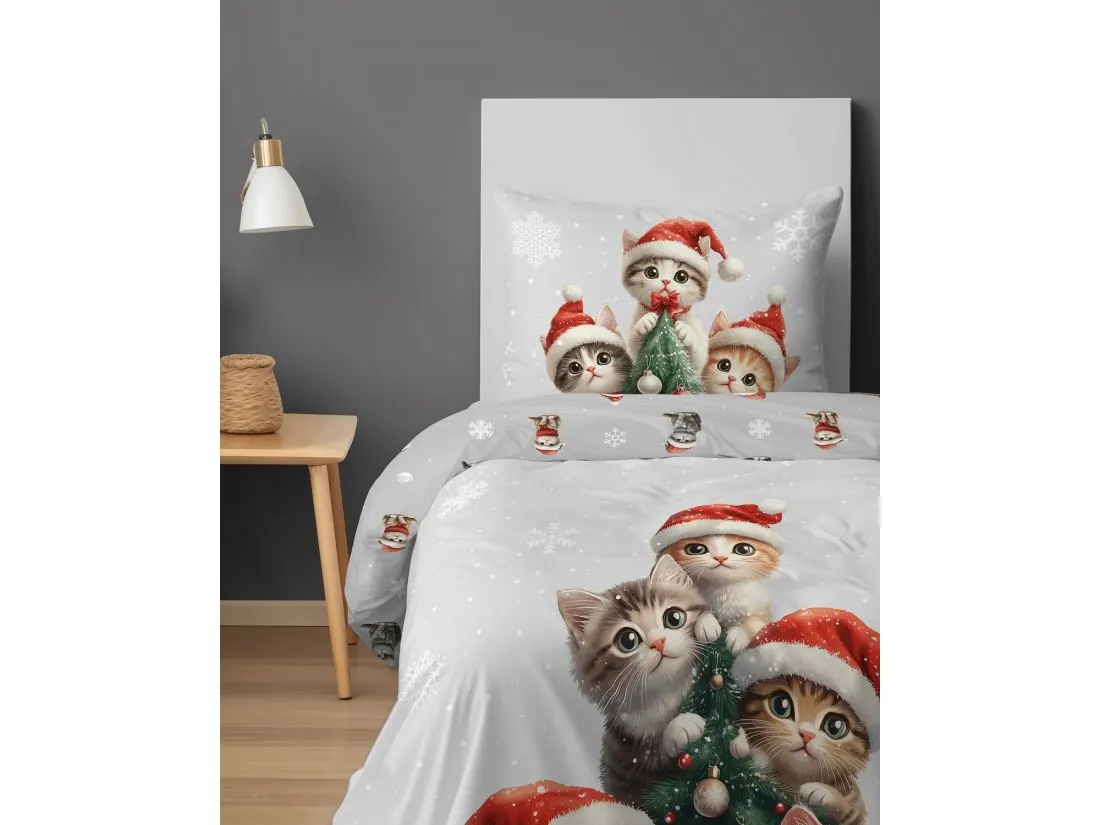 Poszewka na poduszkę powtarza motyw kotków przy choince, a odwrotna strona pościeli pokryta jest drobnym powtarzalnym wzorem kotków w czapkach, co zapewnia spójność i lekkość kompozycji.
