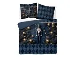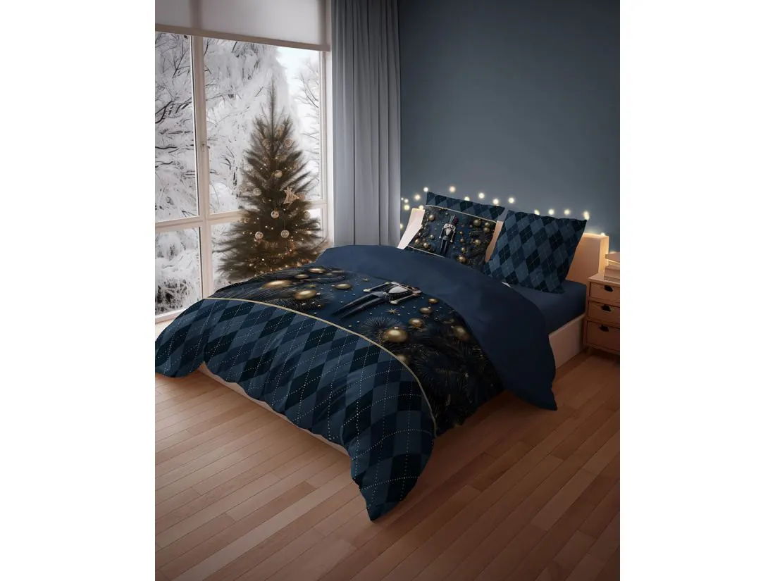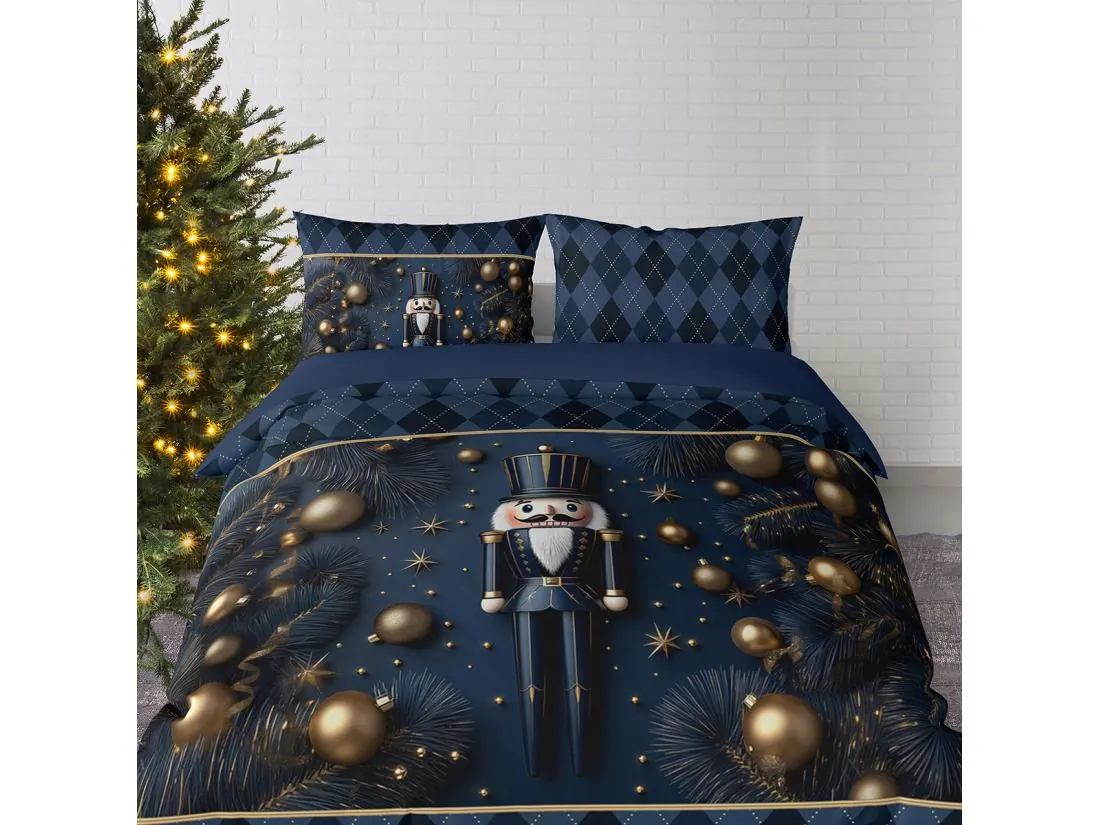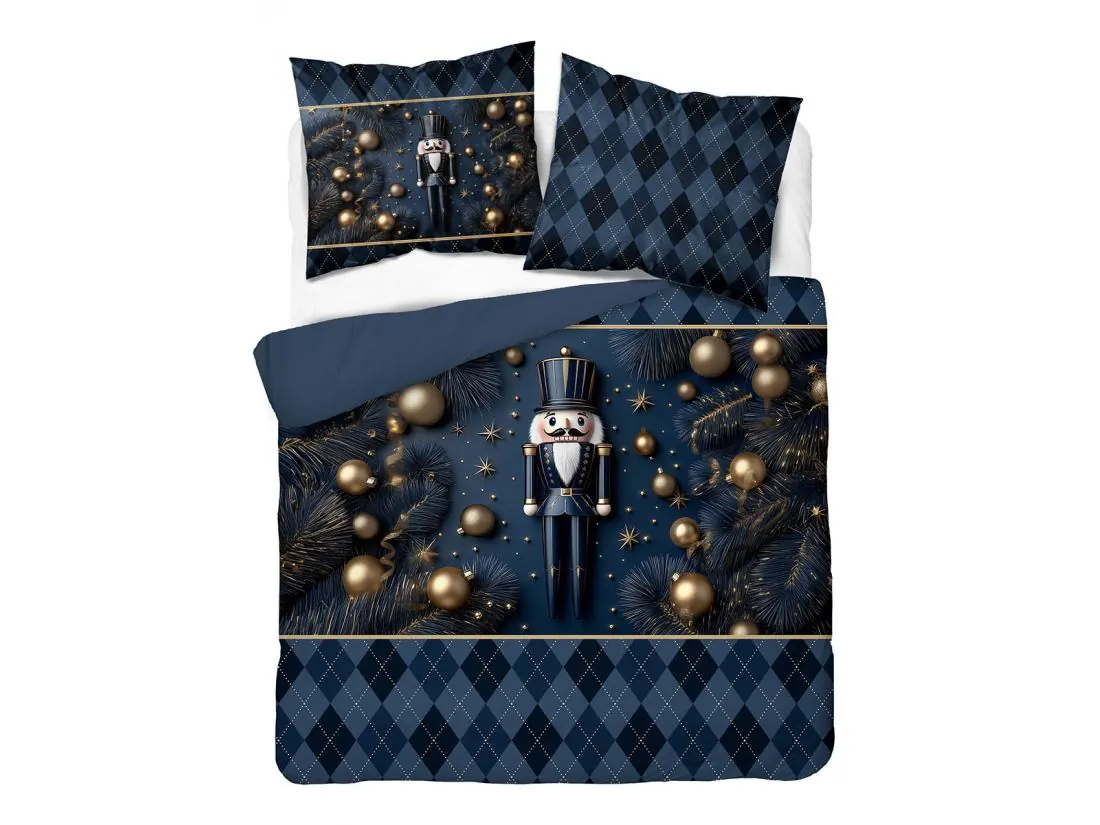 Głównym motywem pościeli jest klasyczny dziadek do orzechów w eleganckim granatowym mundurze, który zdobi centralną część zarówno poszwy na kołdrę, jak i poduszek. Otacza go świąteczna kompozycja z gałązek choinki oraz złotych bombek i dekoracji, nadających całości szlachetny i luksusowy charakter. Dół kołdry oraz jedna z poduszek ozdobione są subtelnym wzorem w romby (argyle) w odcieniach granatu, które są delikatnie przełamane jasnymi liniami punktowymi, podkreślającymi elegancję zestawu. Druga poduszka łączy oba wzory, tworząc harmonijną i wyważoną kompozycję. Taki wzór doskonale wpisuje się w świąteczny wystrój wnętrz, łącząc tradycję z nowoczesną klasą.